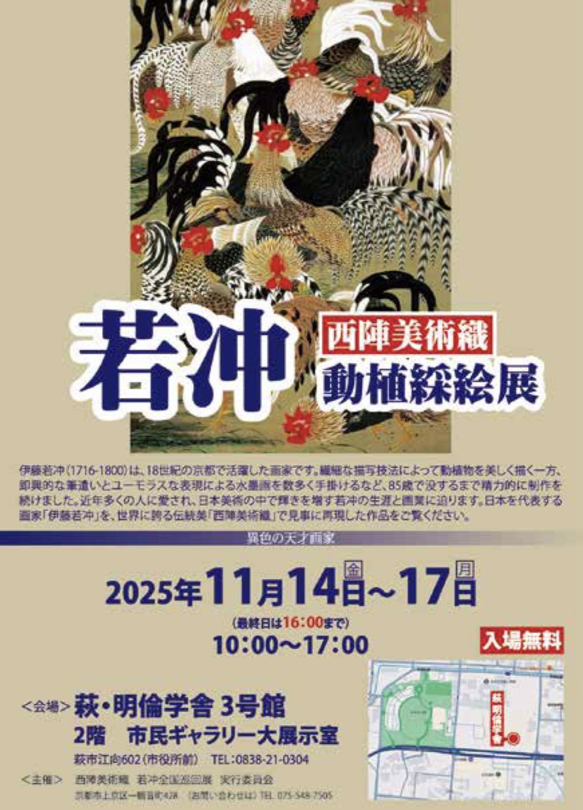 日本を代表する画家「伊藤若冲」を、世界に誇る伝統美「西陣美術織」で見事に再現した掛け軸作品を展示します。
