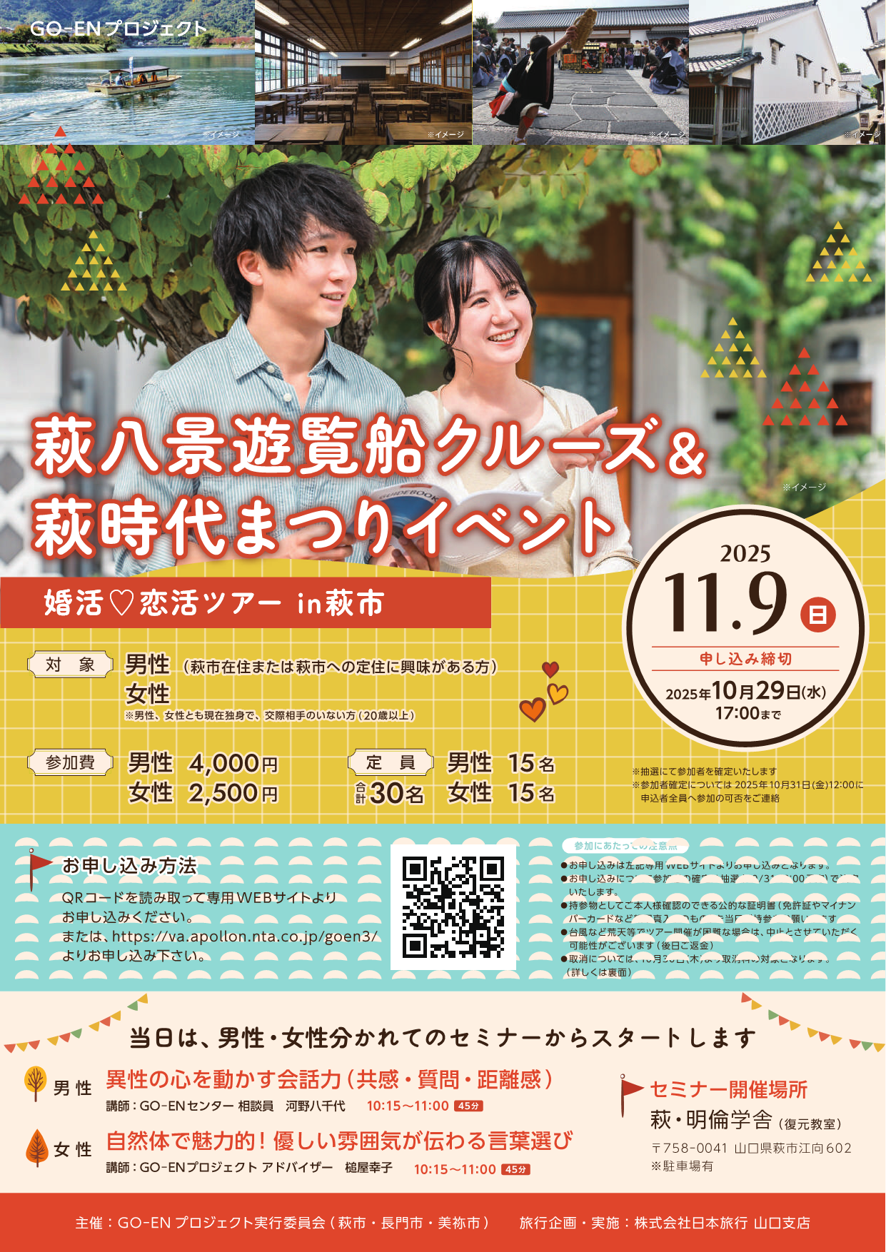 萩時代まつり、萩八景遊覧船など、萩市の自然・観光などを満喫しながら、歴史の街並みの中で自然に仲が深まる婚活恋活ツアーイベントです。