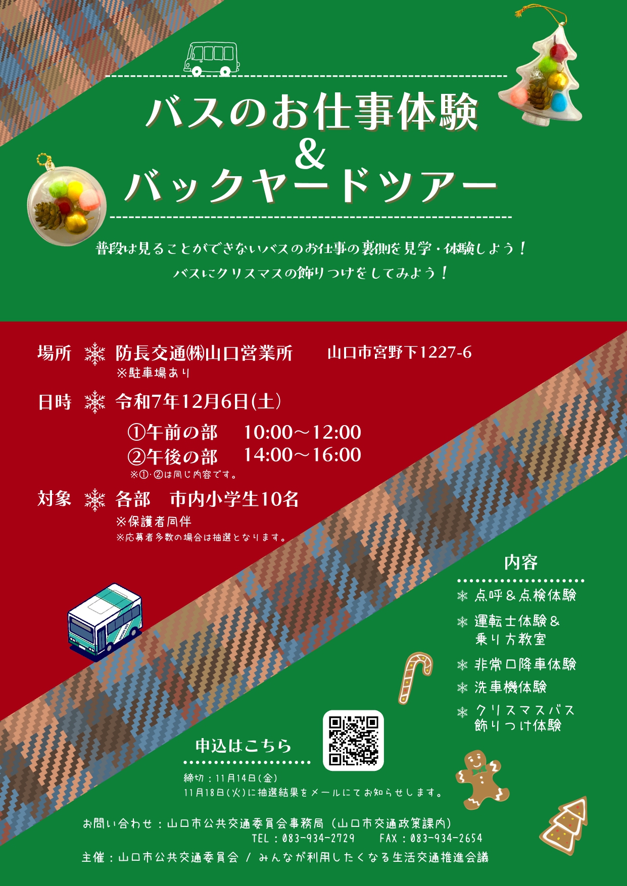 未来を担う子どもたちにバスを身近に感じてもらうため、普段は見ることができないバスの仕事の裏側を見学・体験できる「バスのお仕事体験&バックヤードツアー」を開催します。あわせて、毎年12月に市内で運行されているクリスマスバス車内の飾りつけ体験も実施します。