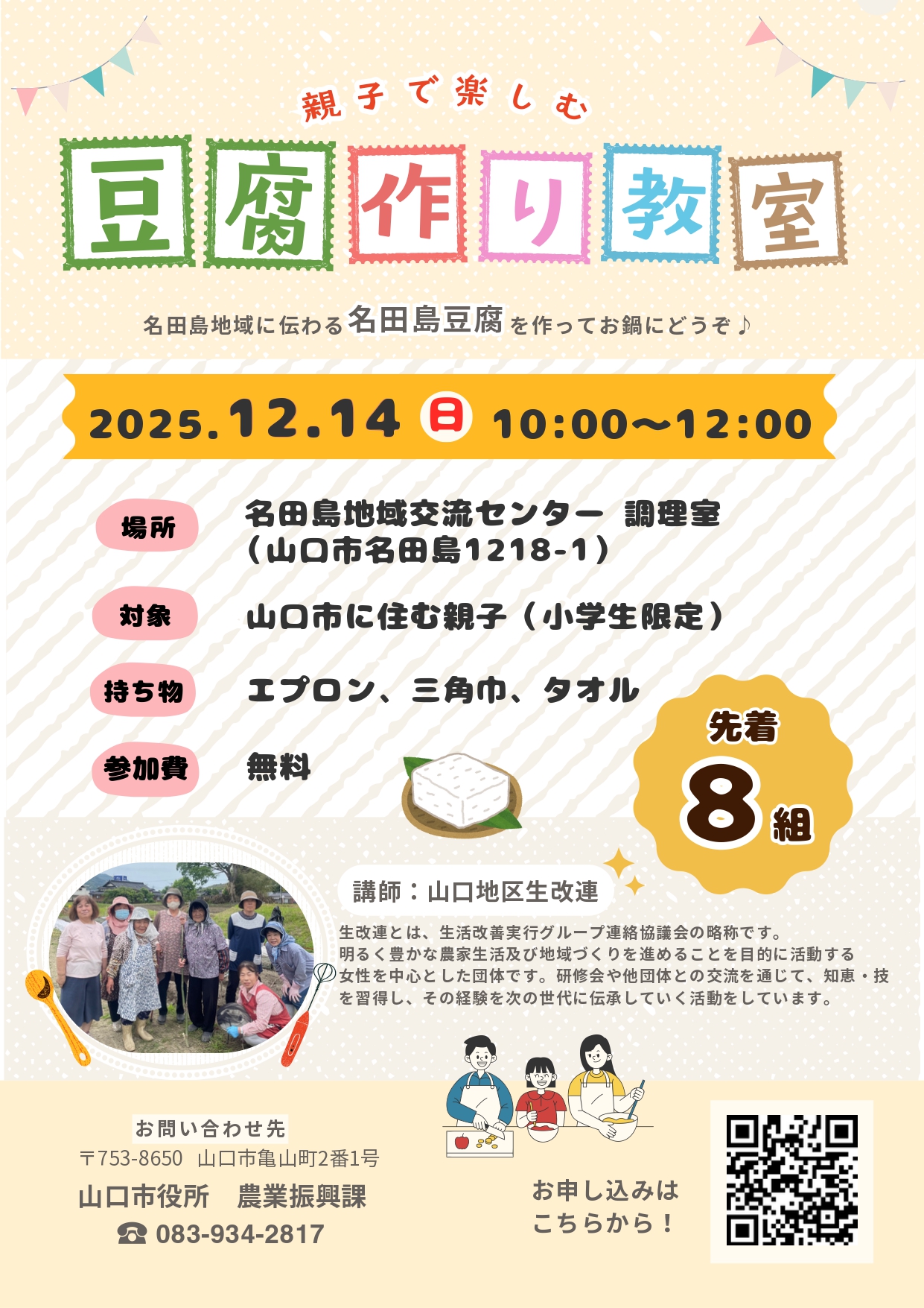 名田島地域に伝わる「名田島豆腐」の作り方を学ぶことができる機会です。