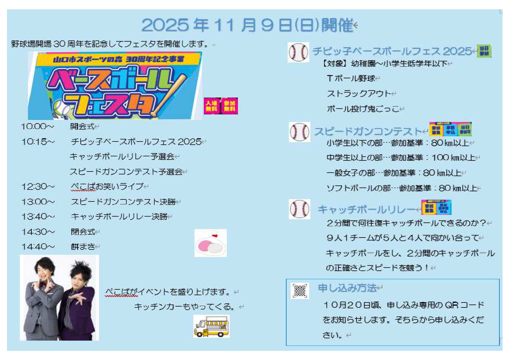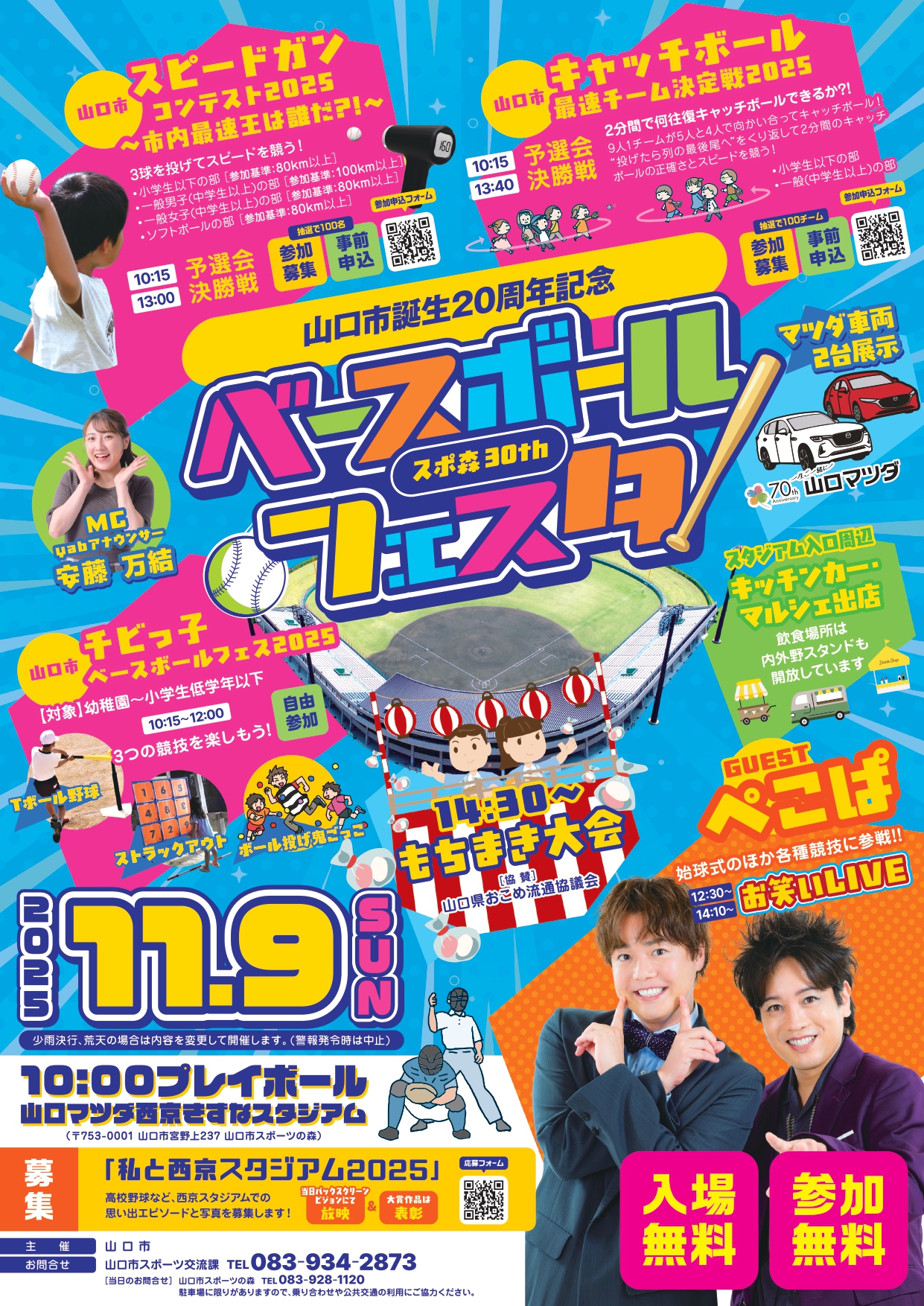 山口市スポーツの森が開場して、11月で30周年を迎えます。そこで30周年を祝って『山 口マツダ西京きずなスタジアム』を会場として、記念事業を開催します。