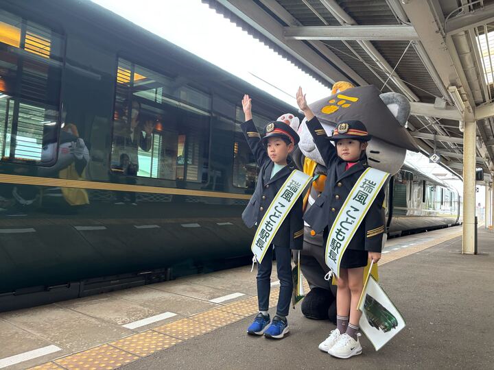 萩市では、JR西日本の寝台列車「TWILIGHT EXPRESS 瑞風」の立ち寄りを歓迎し、東萩駅にて「こども駅長」によるおもてなしを行っています。