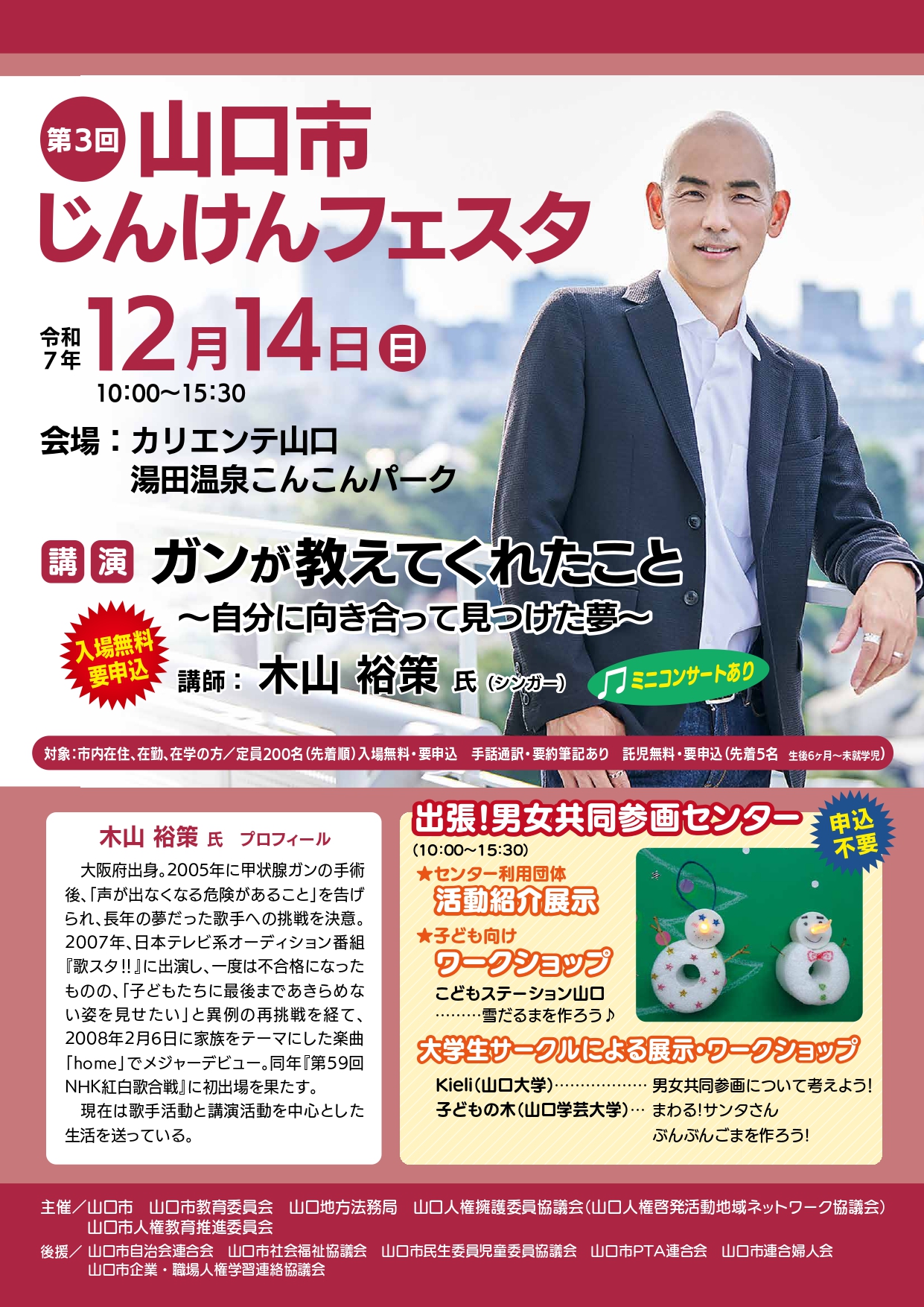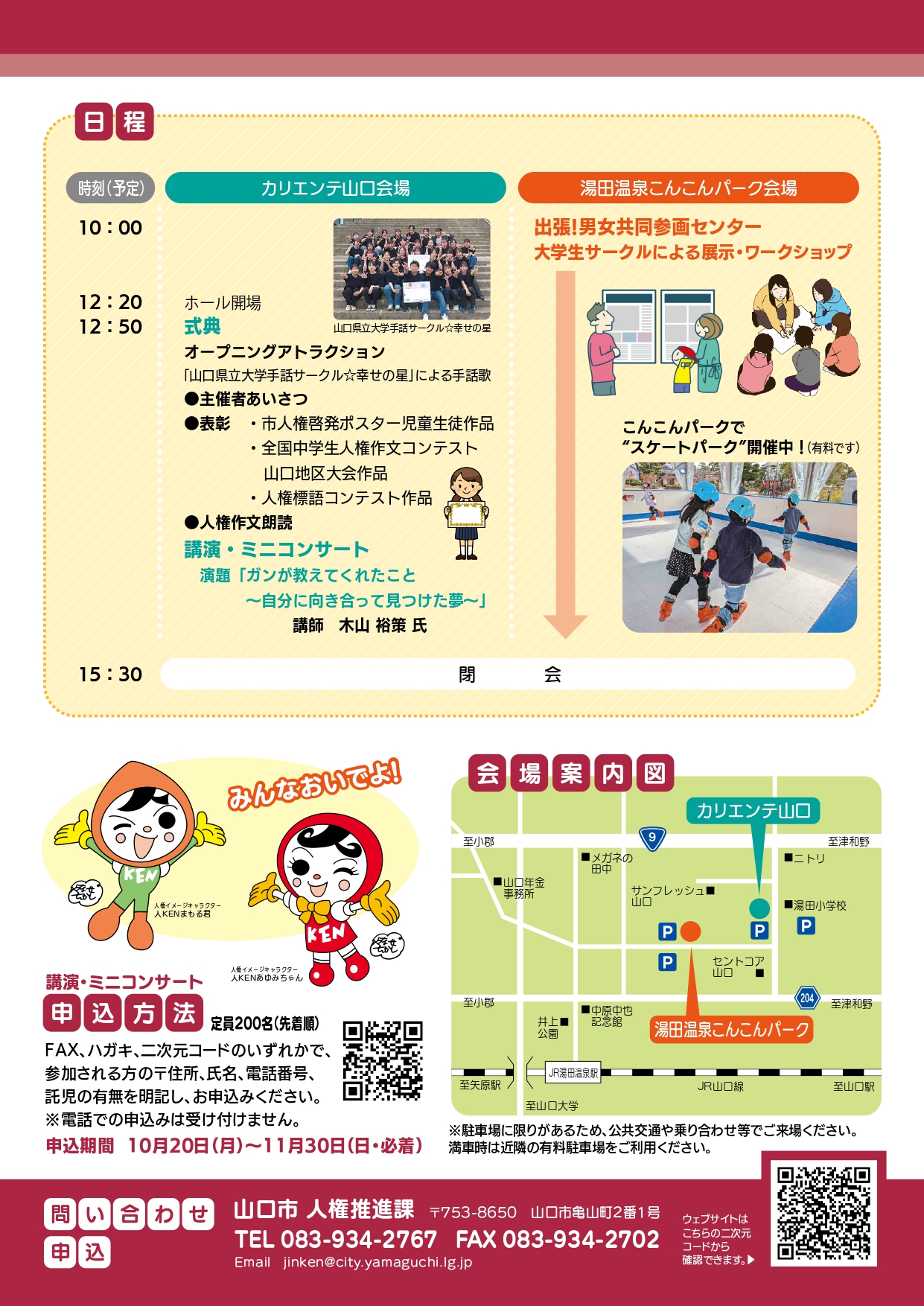 家庭、学校、地域社会、職場など、様々な場において、一人ひとりの人権が尊重され、あらゆる人が自分らしく活躍できる共生社会の実現に向けて、男女共同参画の推進や人権啓発を図ることを目的とし、「第3回山口市じんけんフェスタ」を開催します。