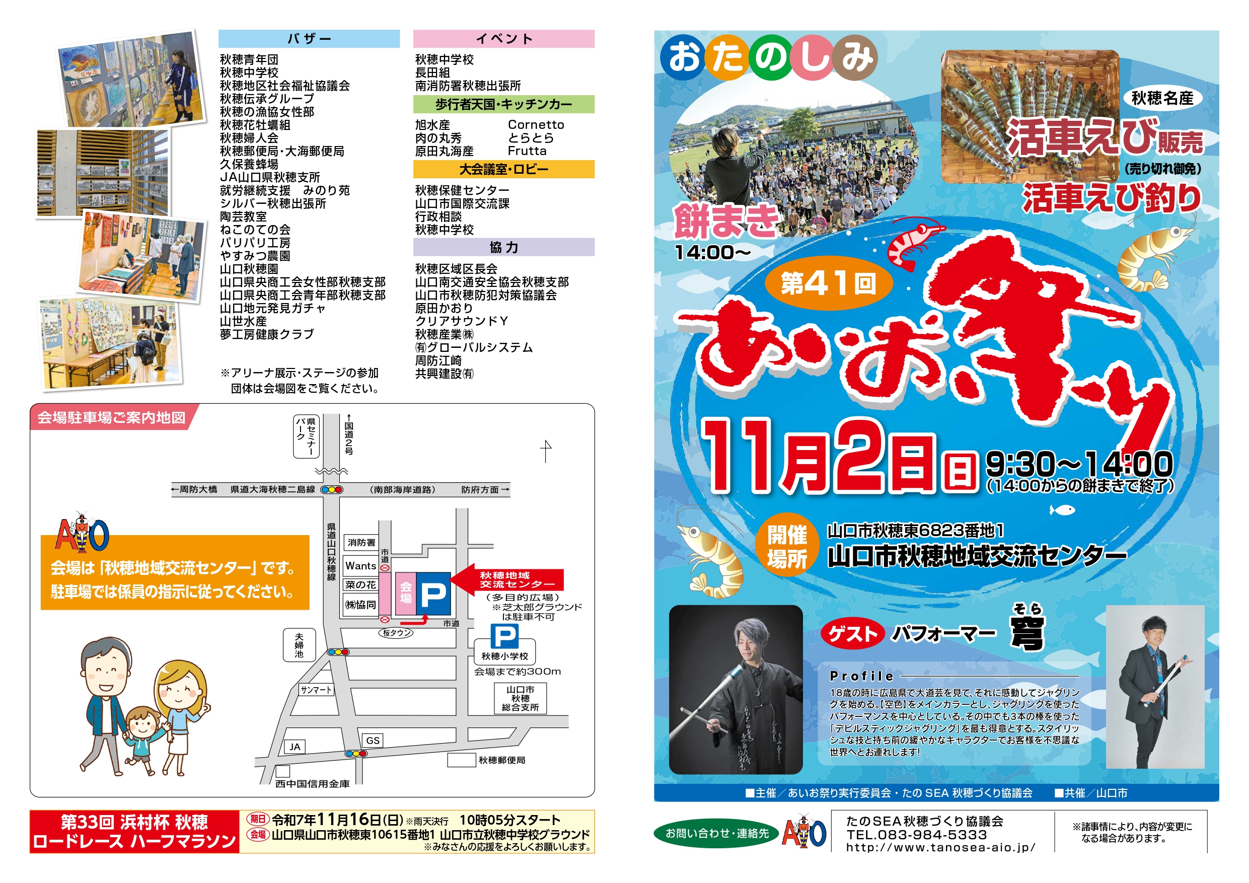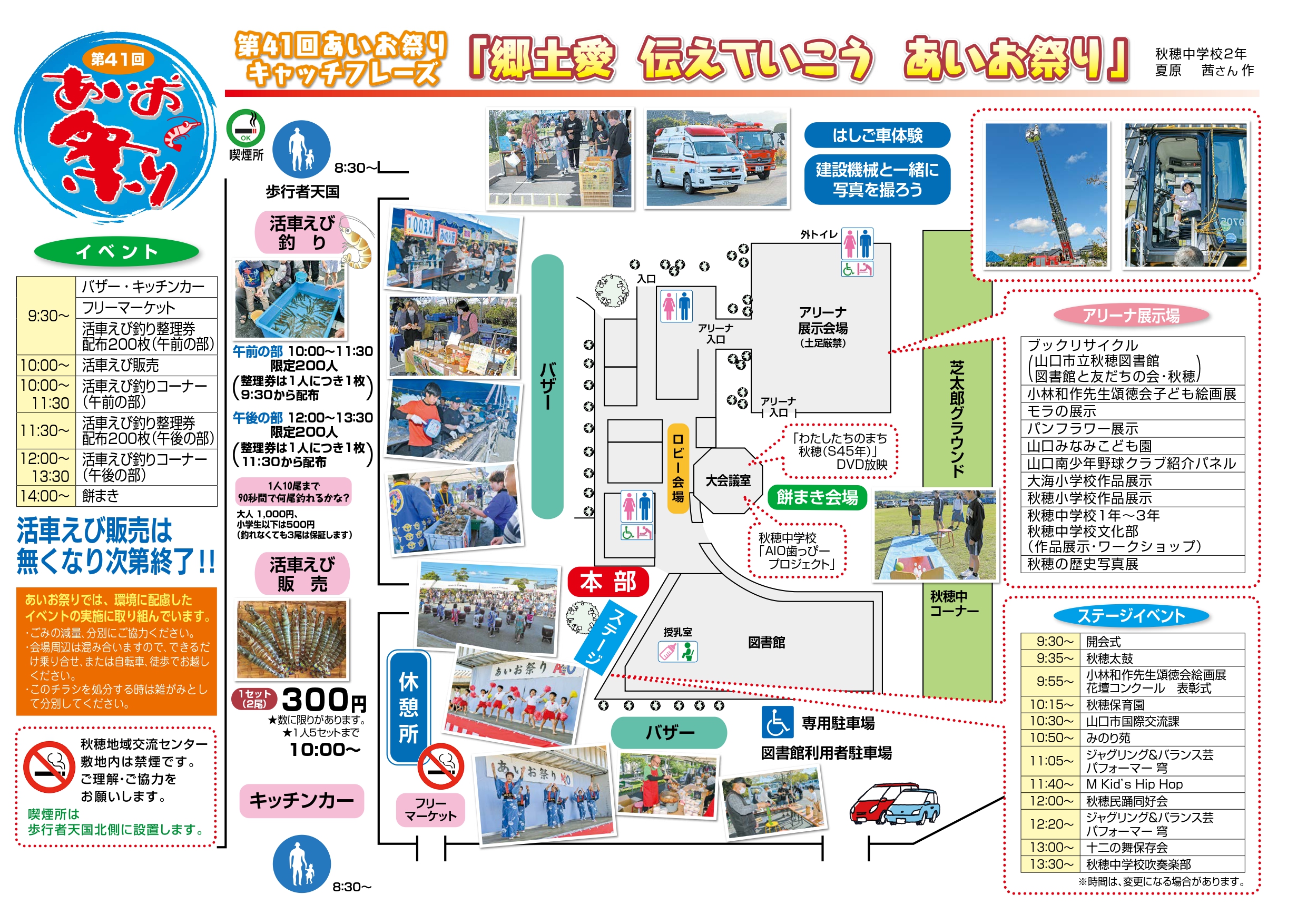 毎年行列ができる秋穂名産の活車えびの販売や、活車えび釣り体験コーナーや、地域内の団体による各種バザー・展示、フリーマーケットの開催も。