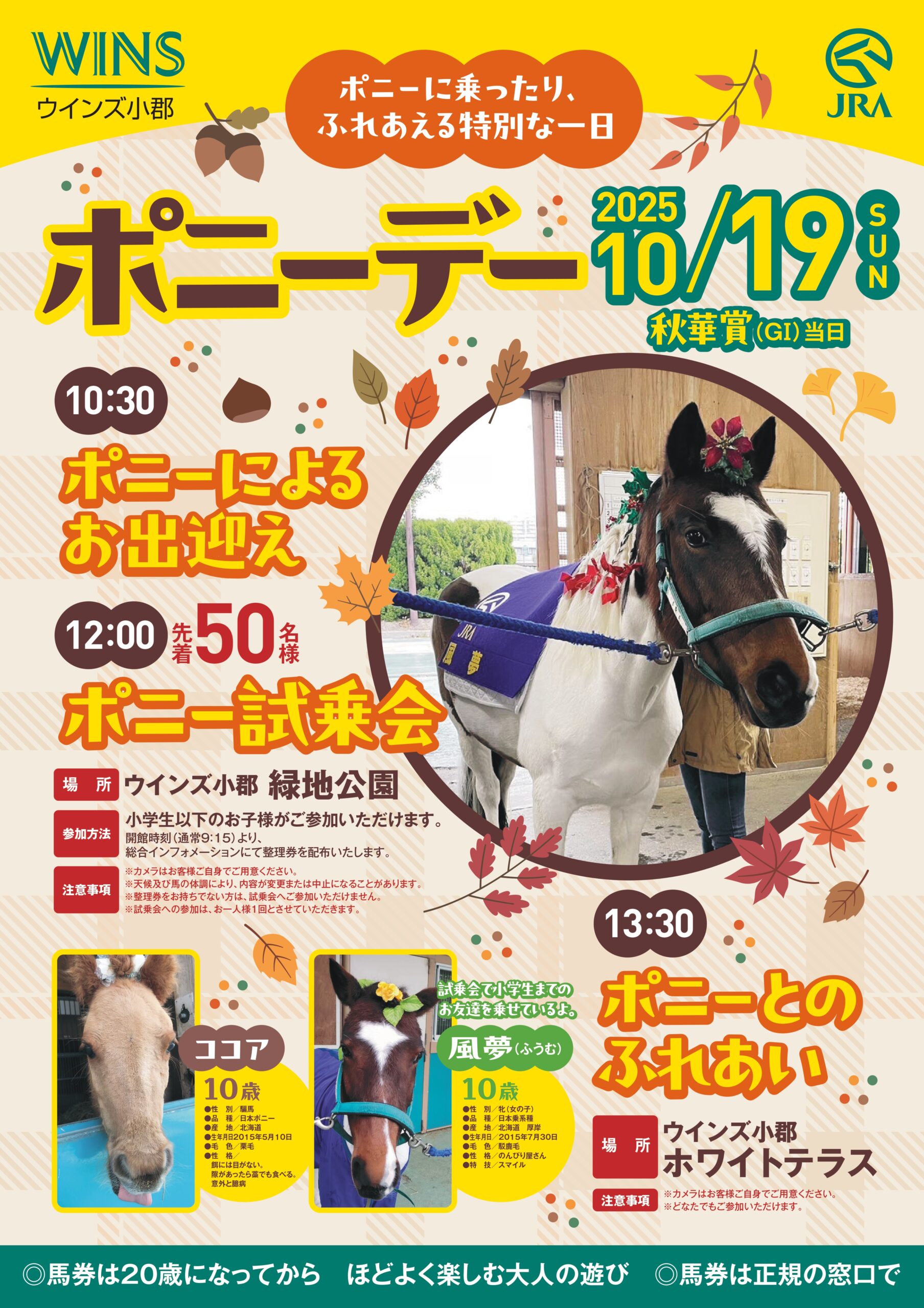 ウインズ小郡は、10月19日(日曜)【秋華賞(GⅠ)当日】、ポニーとのふれあいや記念撮影、お子様向けの試乗会を行います。お友達やご家族とご一緒にぜひウインズ小郡にお越しください。皆様のご来場を心からお待ちしております。