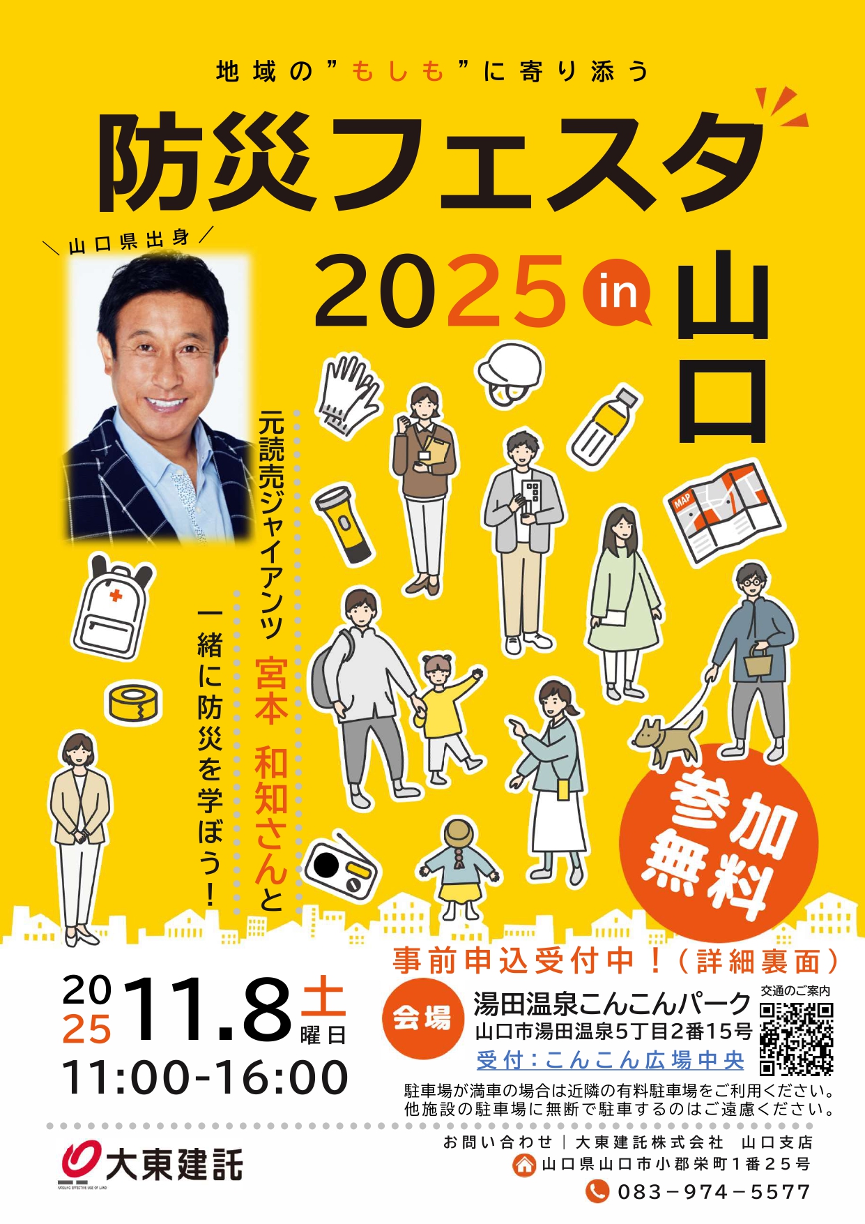元読売ジャイアンツ 宮本 和知さんをお迎えし、防災を学べるイベント「防災フェスタ2025in山口」を開催いたします。前回開催した他の会場でのご参加者さまからは「防災について子どもから大人まで楽しく学べました」などの声をいただきました。