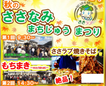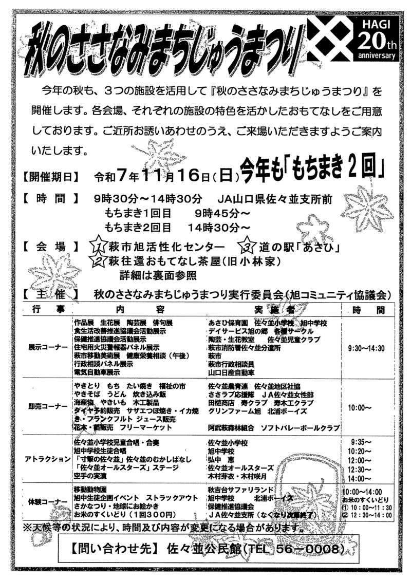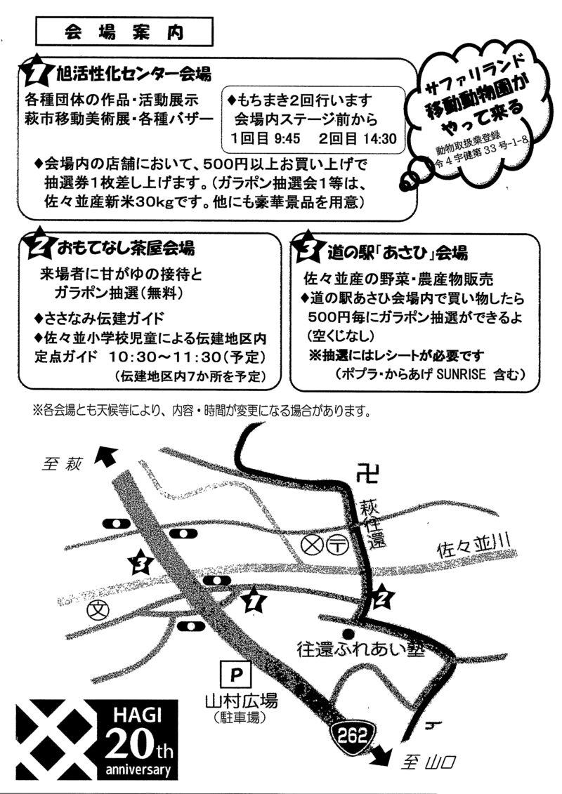 秋吉台サファリランド移動動物園、旭中学校・佐々並小学校ステージ発表、展示、バザー、もちまき、ガラポン抽選会、地元産農品の即売などがあります。
