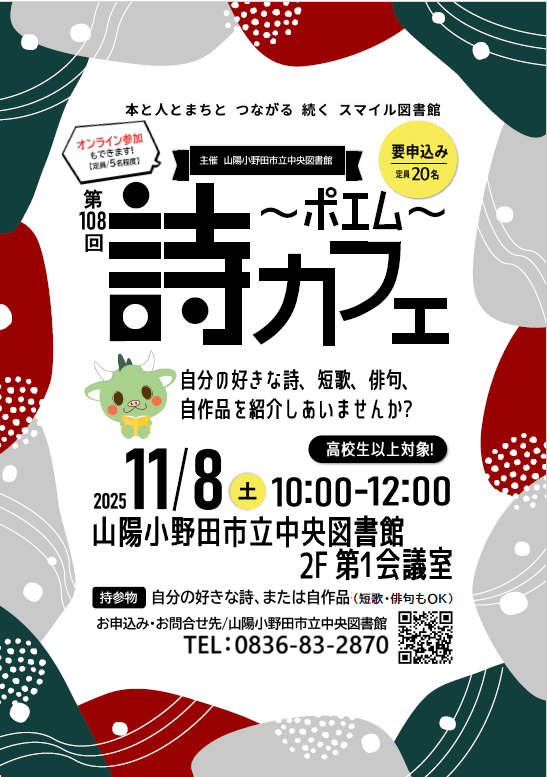 - 20人(要申込み)オンライン参加もできます。【定員5名程度】自分の好きな詩、または自作の詩を持ってきてください(短歌・俳句でもOK!)