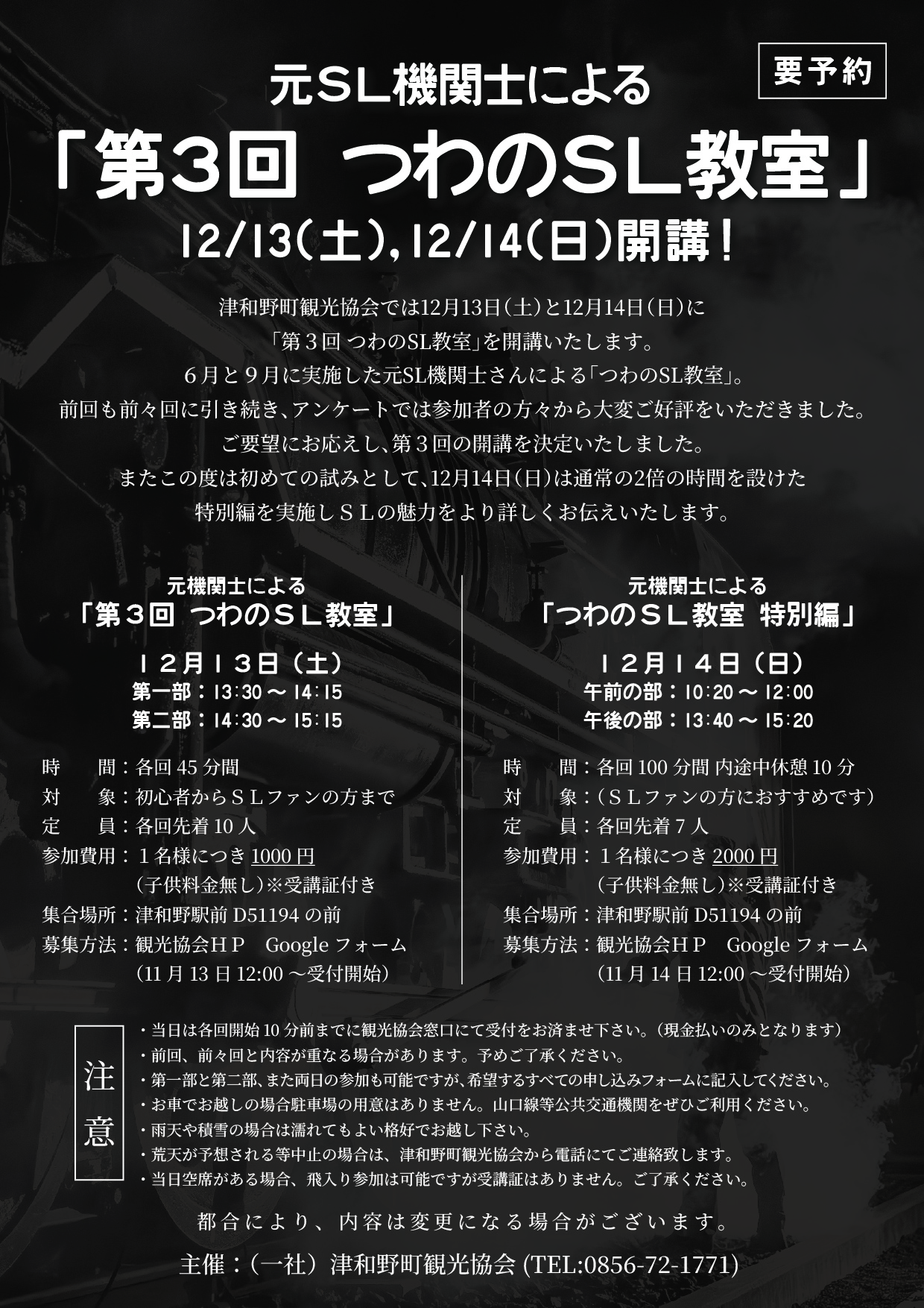 12月13日(土)と12月14日(日)に「第3回 つわのSL教室」を開講いたします。