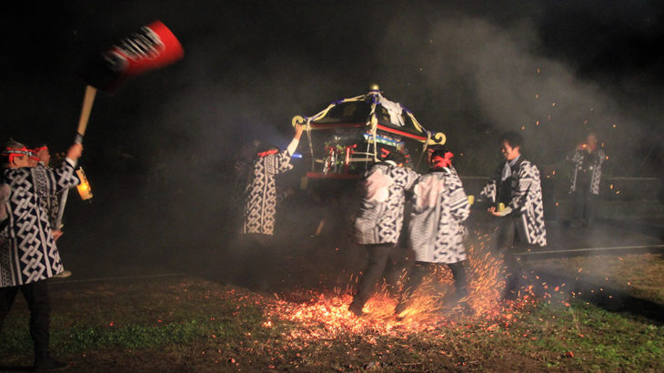 火の神様を迎え入れるため、神輿の担ぎ手が薪を焚いた「迎え火」を蹴散らして火の粉をあげる大迫力の伝統行事。鷲原八幡宮を出発し、各御旅所を経由しながら鷲原八幡宮まで戻ってきます。