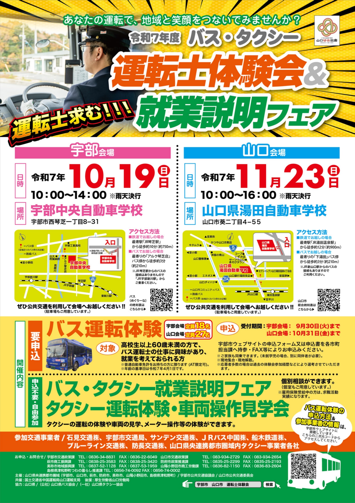 そこで、山口県央連携都市圏域(山口市、宇部市、萩市、防府市、美祢市、山陽小野田市、島根県津和野町)の取組として、バスやタクシーの運転士の仕事を知ってもらい、就業のきっかけづくりとなる体験会&就業説明フェアを、山口市と宇部市の2会場で開催します。