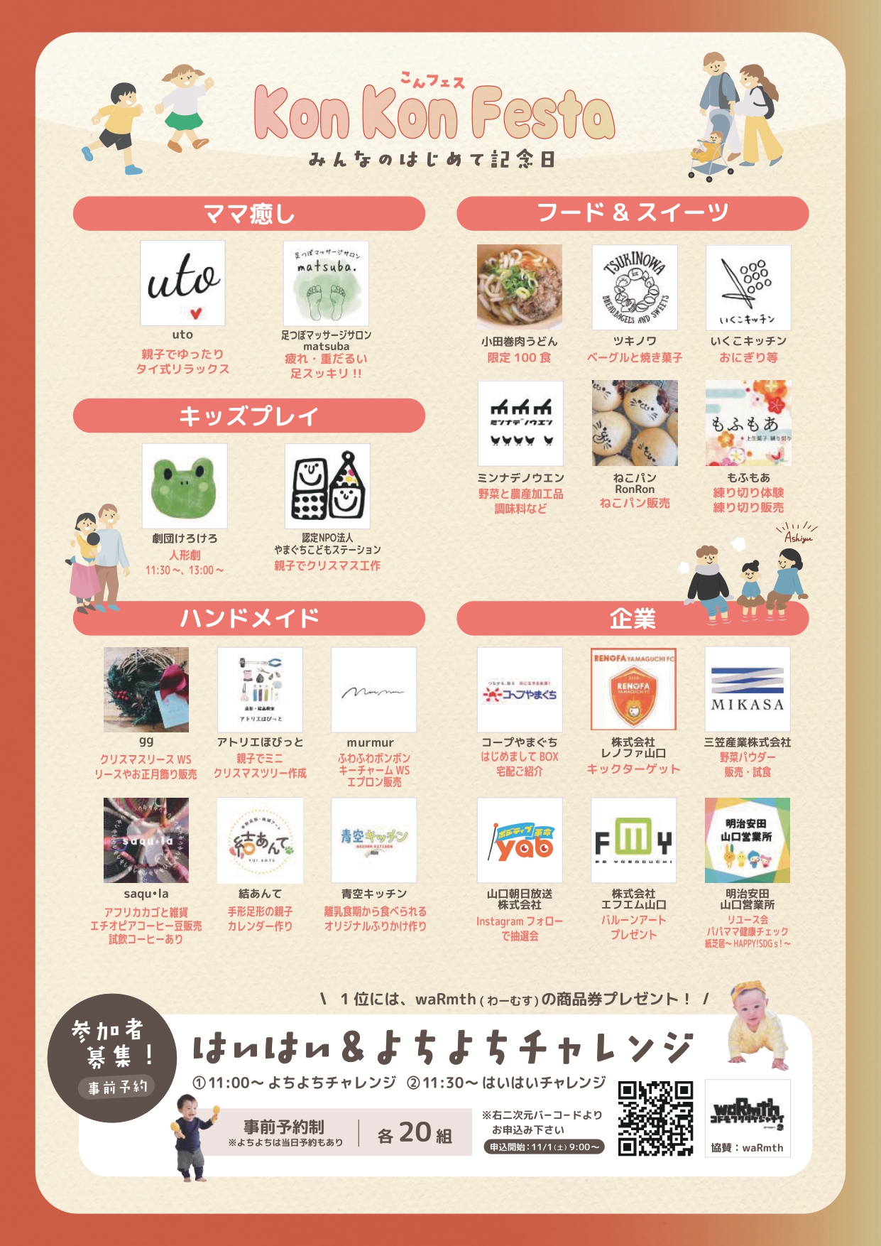 「こんフェス」は、子育て中のご家族みんなで楽しむ“はじめて記念日”のイベントです。はいはい&よちよちチャレンジやサンタクロースとの記念写真など多彩な企画が満載。そして、小さな子どもがいて普段はなかなか足が運べない地元の人気グルメも一同に会します!レノファ山口のマスコット「レノ丸」も遊びにきます!