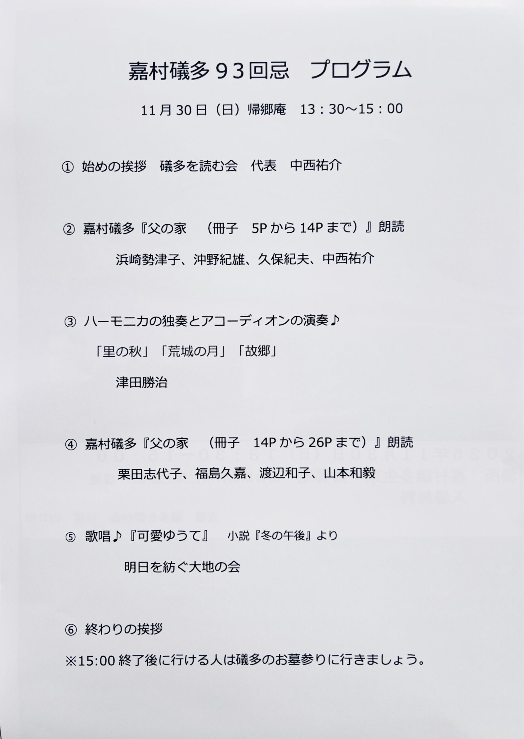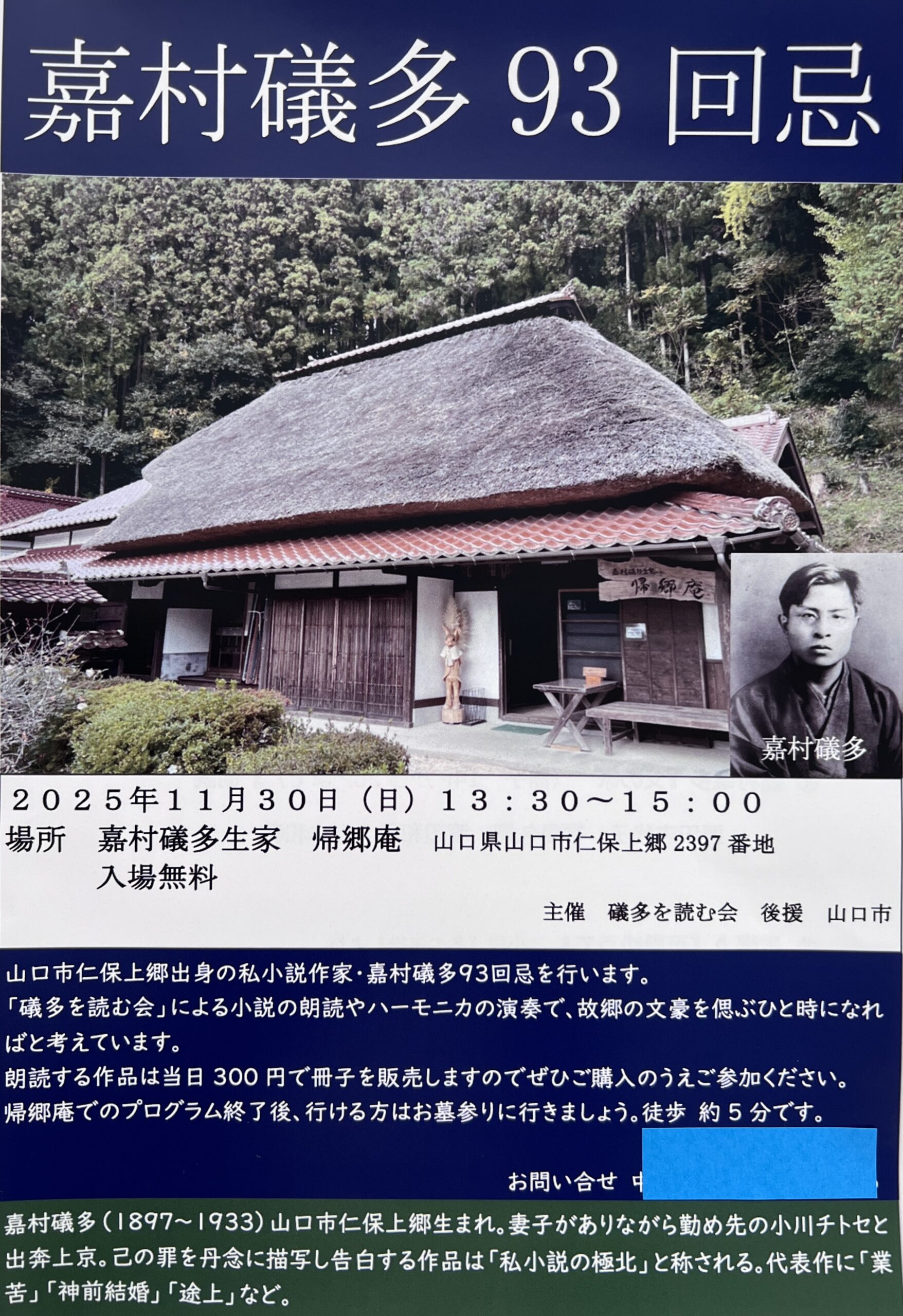 礒多を読む会さん主催で、嘉村礒多93回忌が行われます。