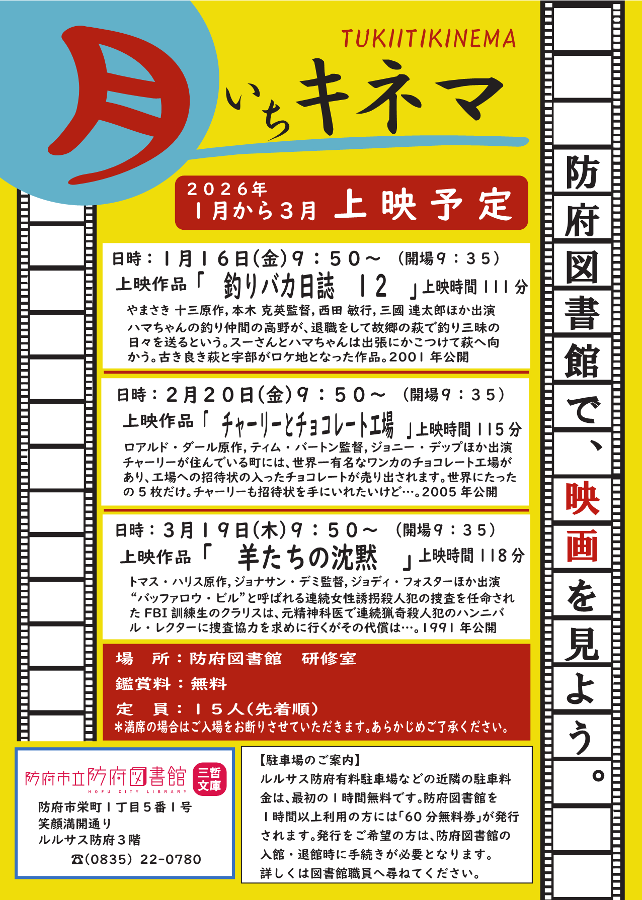防府市立防府図書館では、毎月1回懐かしい映画や話題の映画を上映しています。