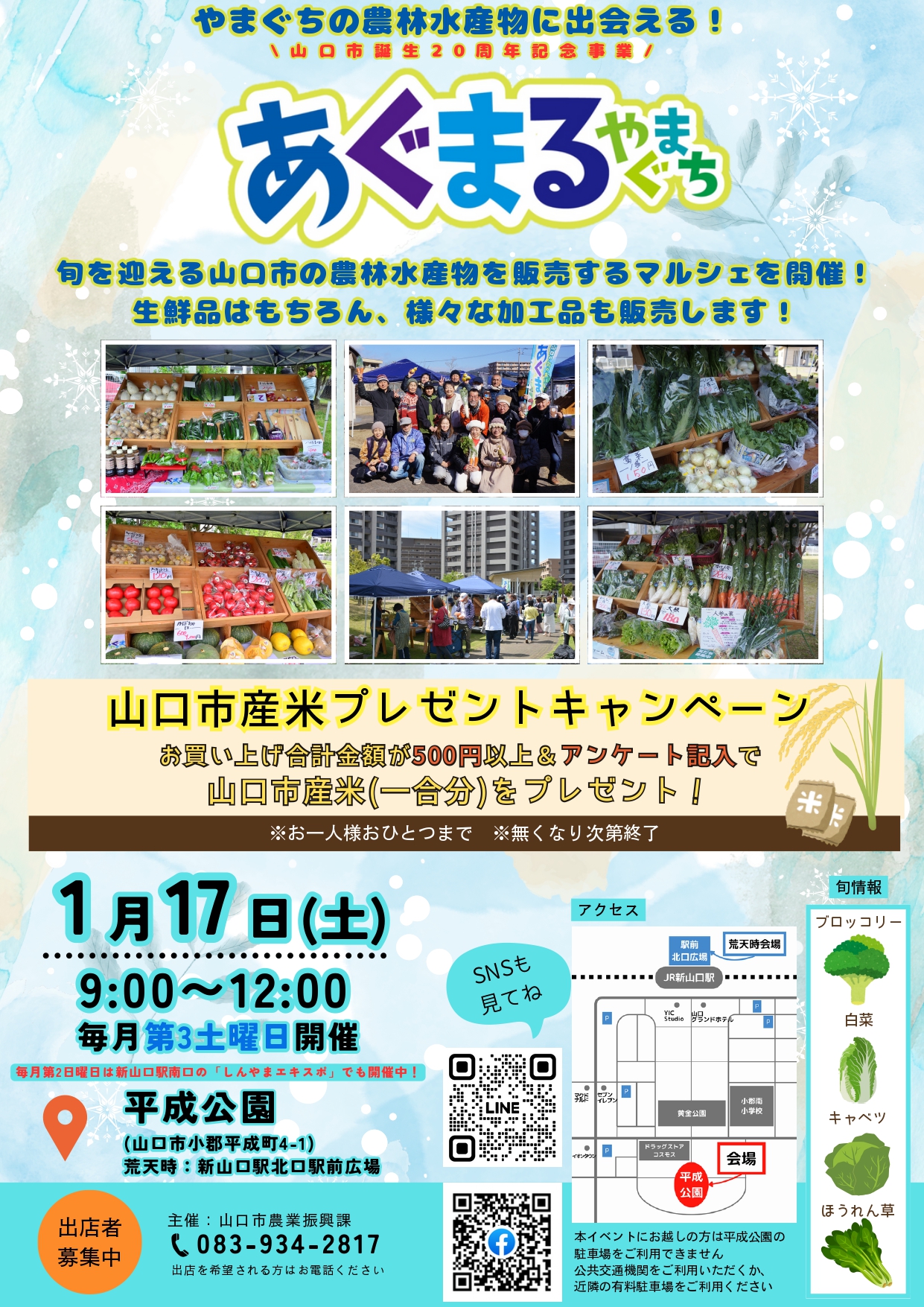 あぐまるやまぐちでは出店者を募集しています。出店を希望される場合は山口市農業振興課(083-934-2817)へご連絡ください。