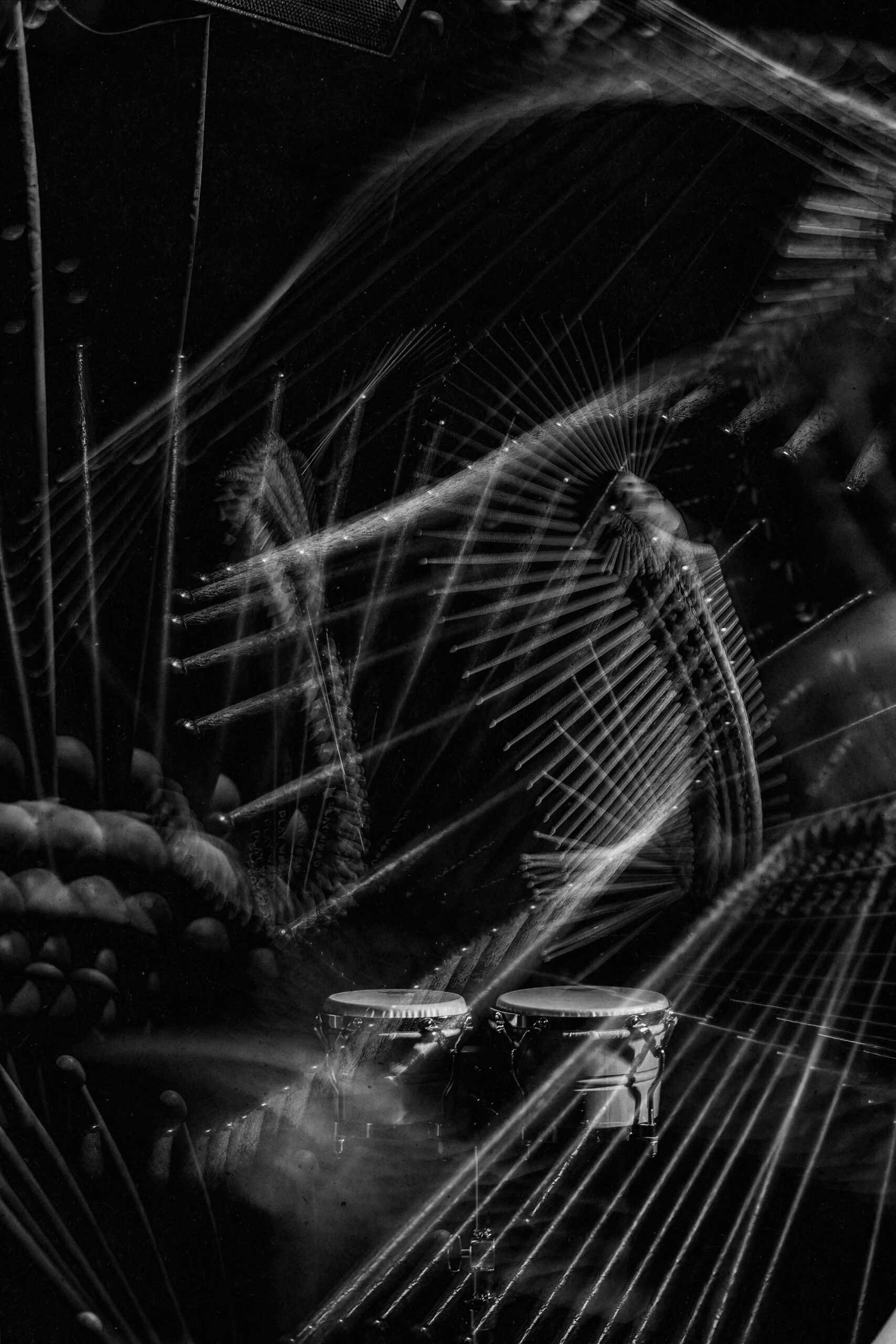 タイトルの『Chronograffiti』は、“時間”を意味する「Chrono」と、“落書き”を示す「Graffiti」を組み合わせた造語で、時間と身体の運動が空間に刻む一種の残像や、視覚的な痕跡をイメージさせる言葉です。本作では、奏者の身体動作と時間的なリズム構造が空間の中に“描き出す”知覚的な軌跡をテーマとしています。ステージセットは、ボンゴやタムなどの必要最小限の打楽器のみで構成されており、要素を極度に絞り込んだ環境のなかで、リズムの反復と変容から陶酔的なミニマリズムを生み出すことを目指しています。演奏は、元・鼓童の前田剛史、日本管打楽器コンクール第1位の安藤巴、日野作品に継続的に参加してきた谷口かんなの3名。三者の身体的なリズム操作が絡み合うことで、作品特有の立体的なリズム構造が形づくられます。さらに、古舘健によるヴィジュアルエフェクトが、演奏者の動作や打楽器の局所的な振動をストロボ的な照明効果と連動させ、肉眼では捉えきれない微細なムーブメントを視覚的に浮かび上がらせます。映像機器を用いない、照明のみで成立する独自の視覚表現は、本作の特徴的な要素のひとつです。
