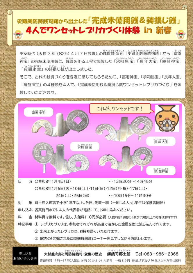【要申込】史跡周防鋳銭司跡から出土した「完成未使用銭&鋳損じ銭」4人でワンセットレプリカづくり体験in新春