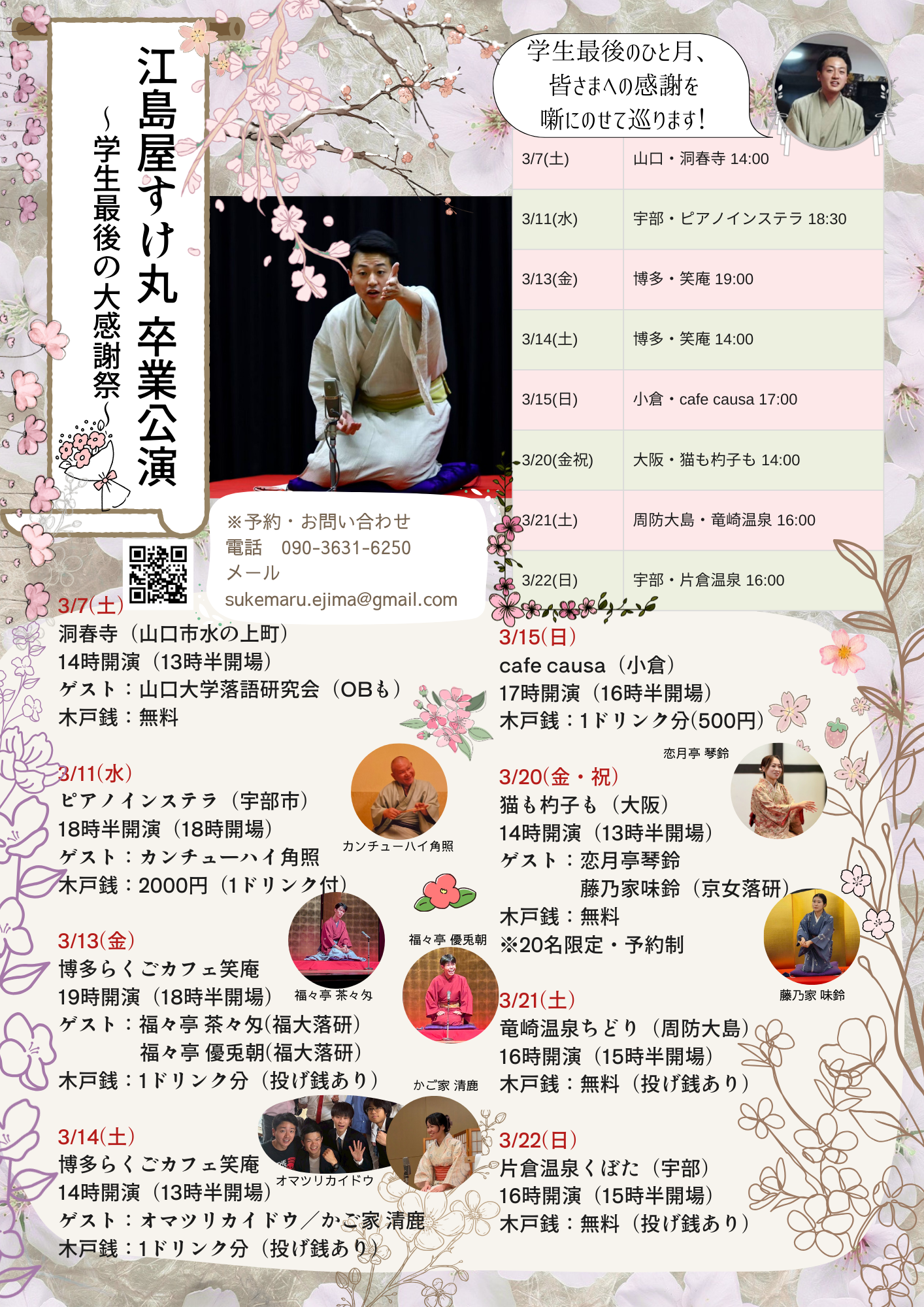 - 7(土) 洞春寺(山口県水の上町5-12) ・11(水) ピアノインステラ(山口県宇部市常盤町2丁目2-17) ・13(金) 博多らくごカフェ笑庵 (福岡県福岡市東区馬出1丁目4-8) ・14(土) 博多らくごカフェ笑庵 ・15(日) cafe causa (福岡県北九州市小倉北区浅野2丁目12-14) ・20(金祝) 猫も杓子も(大阪)猫も杓子も(大阪府大阪市北区天満3丁目4-5 タツタビル301) ・21(土) 竜崎温泉ちどり(山口県大島郡周防大島町東安下庄685-2) ・22(日) 片倉温泉くぼた(山口県宇部市西岐波5345)