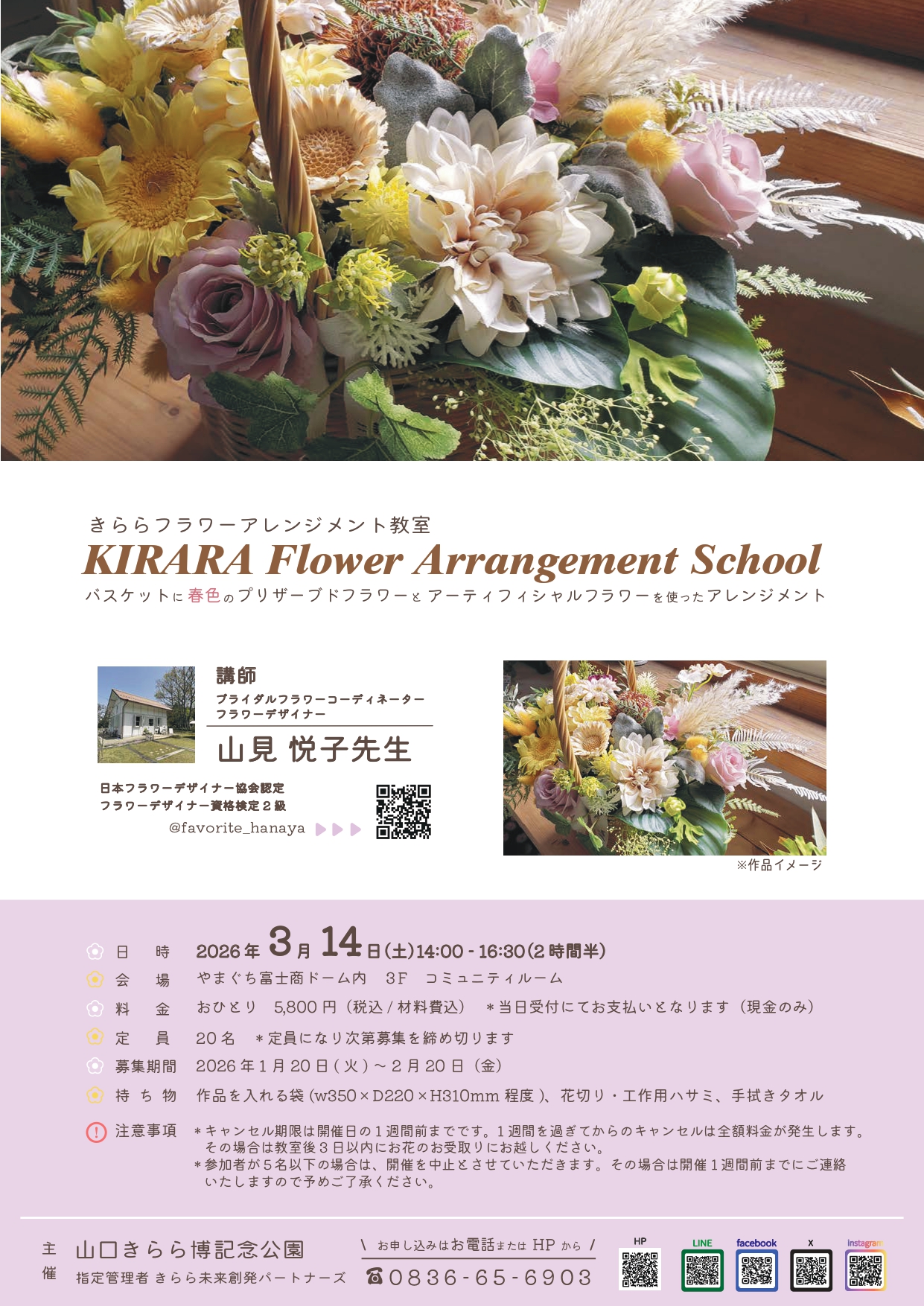 ※キャンセル期限は開催日の1週間前までです。1週間を過ぎてからのキャンセルは全額料金が発生します。その場合は教室後3日以内にお花のお受け取りにお越しください。