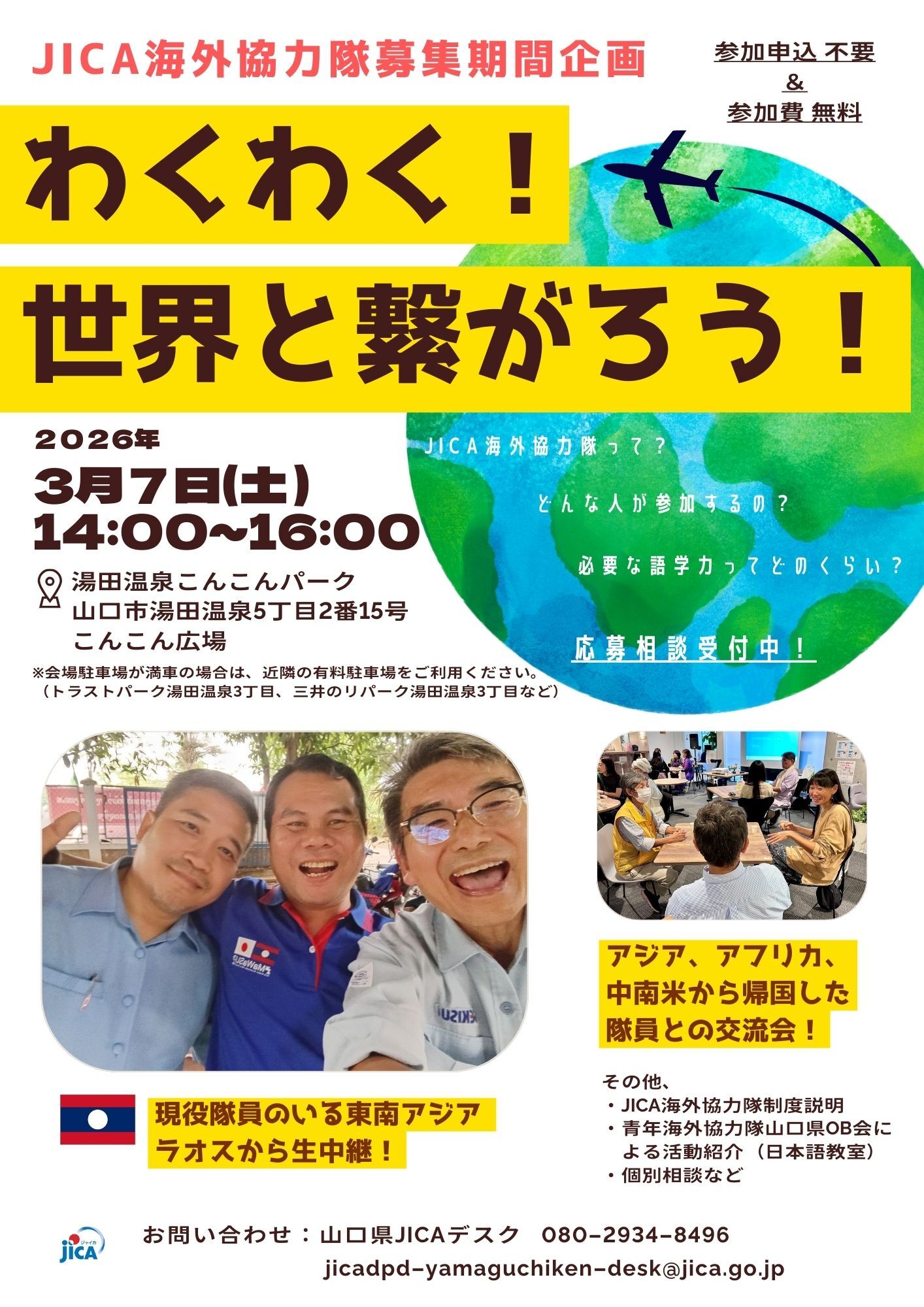 JICA海外協力隊2026年度春募集期間特別企画として、現在開発途上国で活動中のJICA海外協力隊員による生中継企画の他、アジア・アフリカ・中南米で活動し、帰国後に山口県内を盛り上げている元JICA海外協力隊員たちとの交流会や帰国後の活動紹介など、世界と繋がる企画が盛りだくさん!