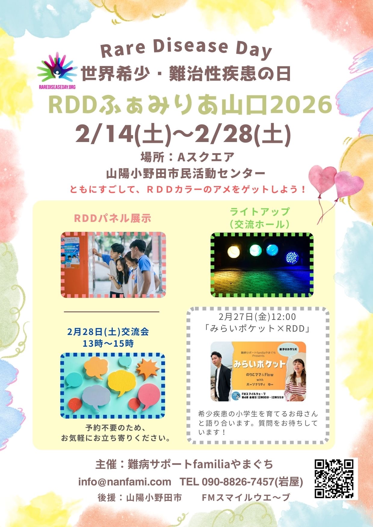 RDD(世界希少・難治性疾患の日)の趣旨に合わせ、山陽小野田市民活動センターの交流ホール一角をRDDカラー(ブルー・マゼンタ・グリーン)でライトアップし、希少疾患への関心を市民へ広く喚起する取り組みである。視覚的な象徴を用いた啓発は、来場者だけでなく通行者や地域住民にも希少疾患を「自分ごと」として捉えるきっかけをつくり、理解促進と認知向上に寄与する。