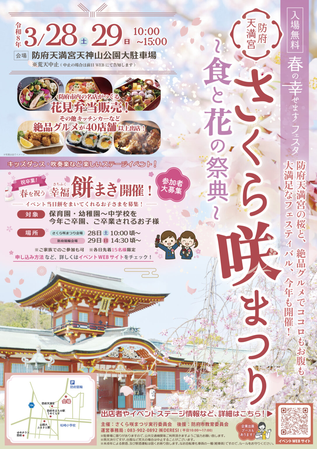 防府天満宮の境内に咲くサクラ約450本が見ごろを迎えるころに”さくら咲まつり”が催され、期間中の3月28日(土)、29日(日)にはグルメとサクラのイベント~食と花の祭典~が開催されます。