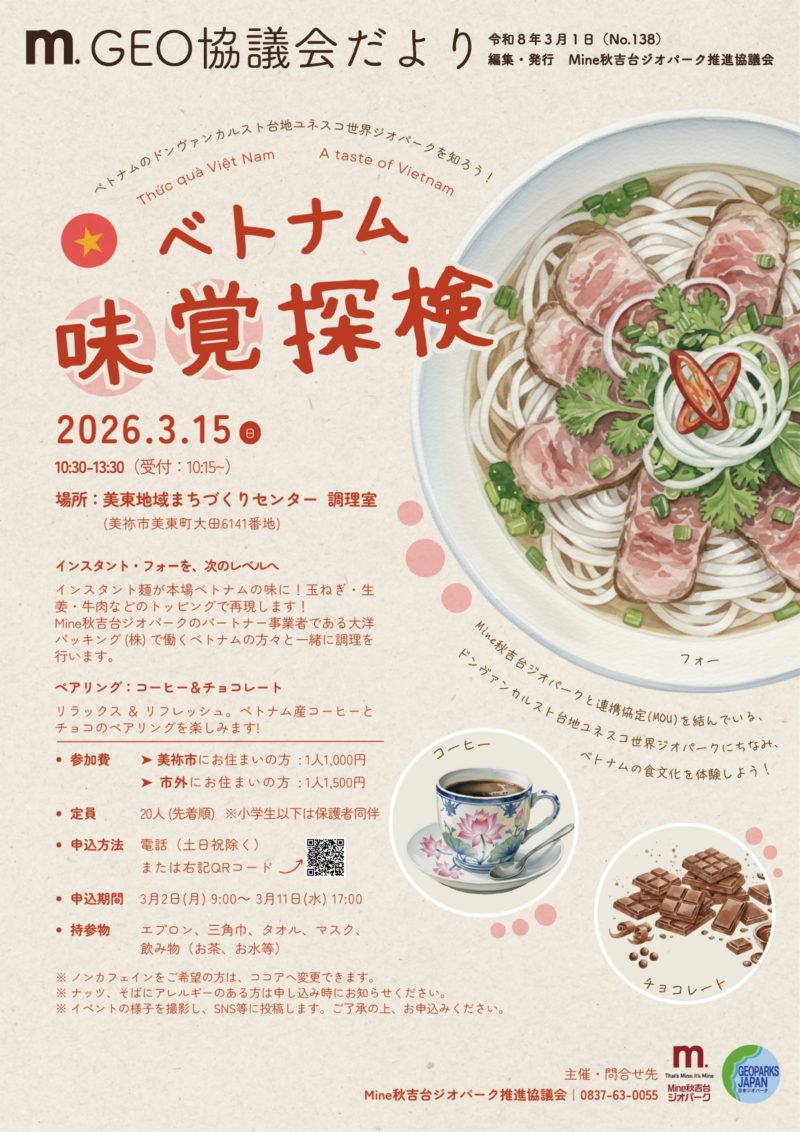 Mine秋吉台ジオパークは、ベトナムのドンヴァンカルスト台地ユネスコ世界ジオパークと連携協定を締結しています。このイベントではMine秋吉台ジオパークのパートナーである大洋パッキング(株)で働くベトナムの方々と一緒に、ベトナムのインスタントフォーやコーヒー、チョコレートを味わいます。また、ドンヴァンカルスト台地ユネスコ世界ジオパークやベトナム文化の紹介も行います。