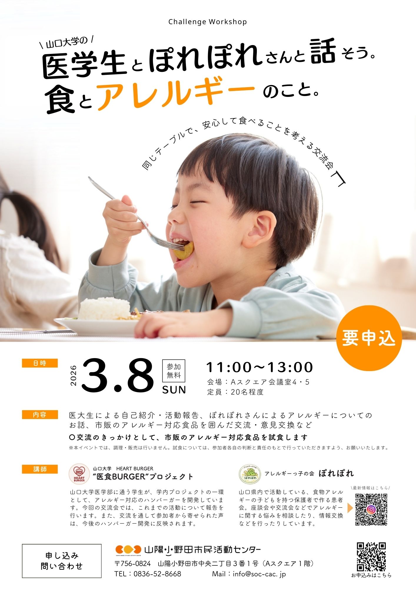 内容:医大生による活動報告、ぽれぽれさんによるアレルギーについてのお話、市販のアレルギー対応食品を囲んだ交流・意見交換など。