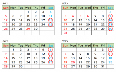 2026年(ねん)4月(がつ)18日(にち)から2026年(ねん)7月(がつ)11日(にち)まで の 毎週(まいしゅう)土曜日(どようび) ※5月(がつ)2日(にち)は 休(やす)み です。