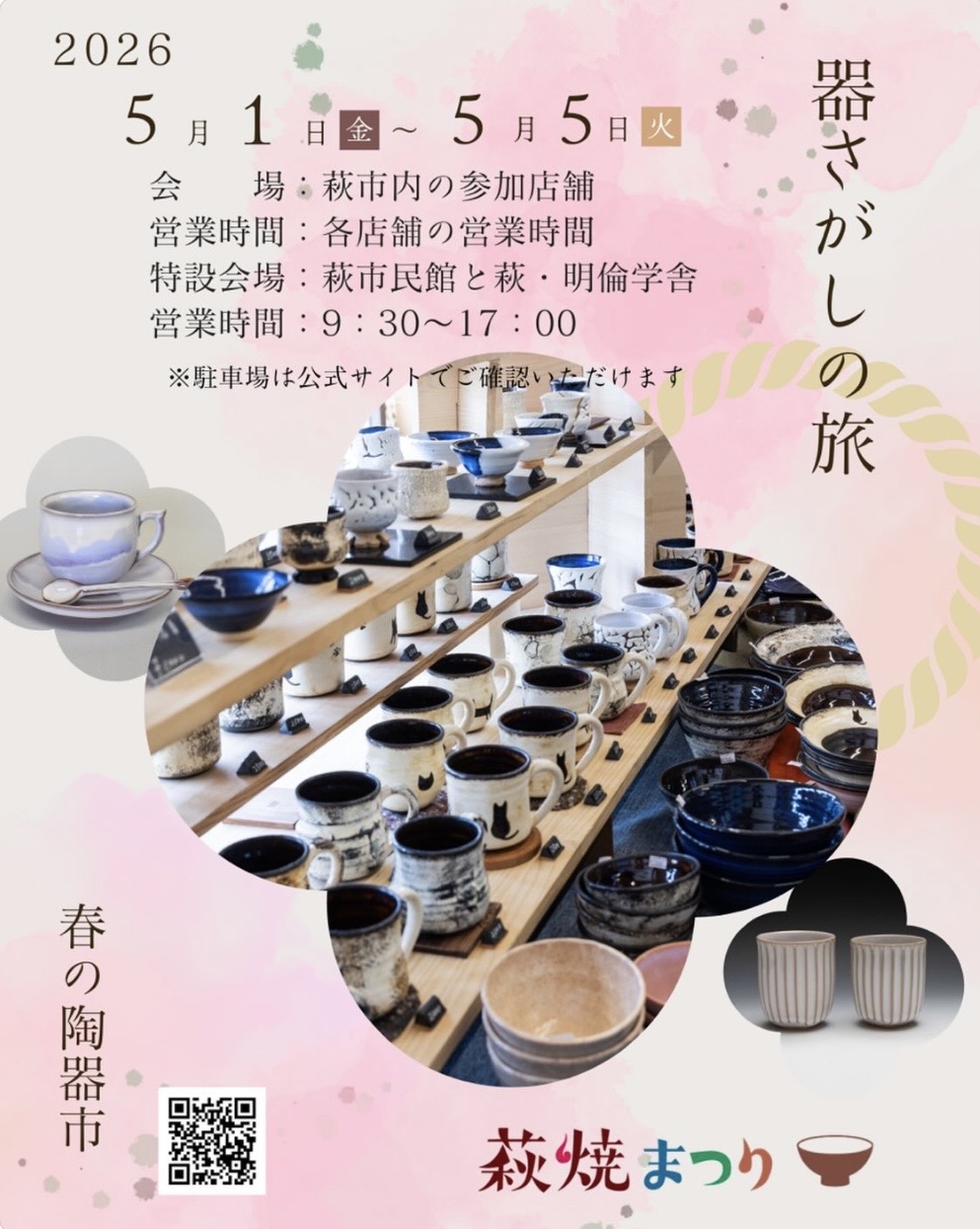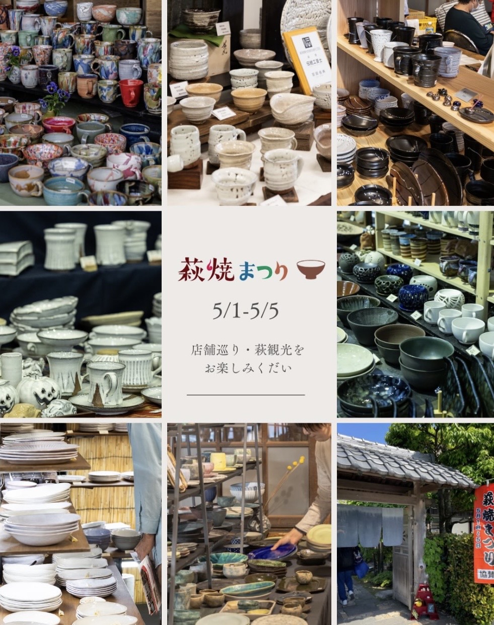 萩焼まつりは、まちじゅう全体が会場として市内の窯元や店舗・特設会場(萩市民館、萩・明倫学舎)などを巡っていただくイベントとなっており、歴史的な城下町とともに観光も楽しんでいただけます。