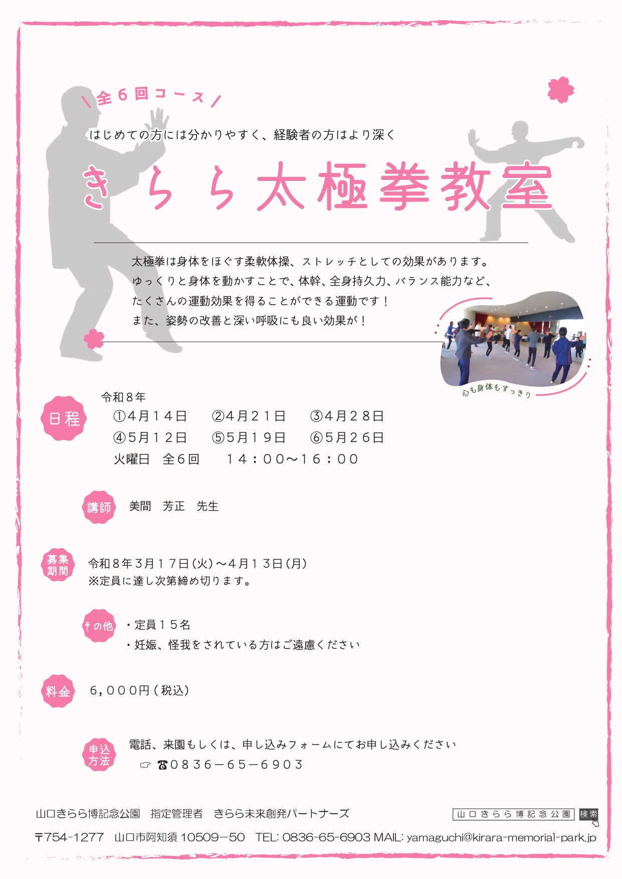太極拳は全身を使うことができ、ゆっくりと身体を動かすことで体幹、全身持久力、脚力、バランス機能の向上などたくさんの運動効果を得ることができます!