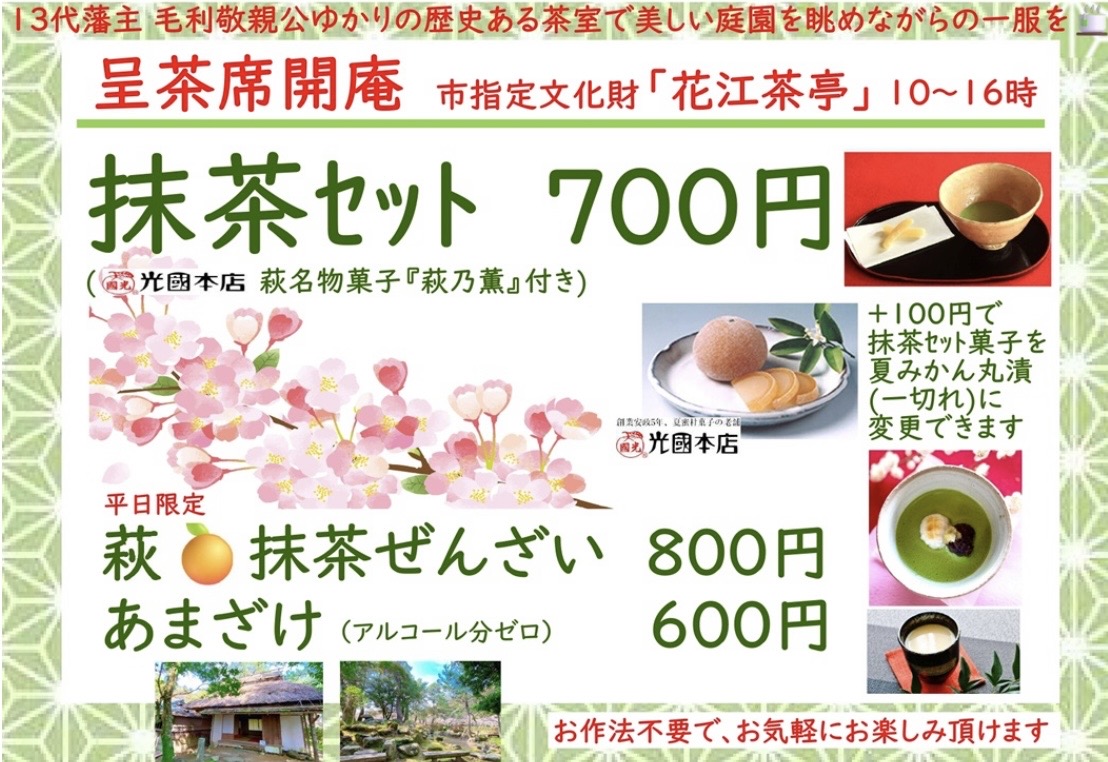 萩藩13代藩主 毛利敬親公ゆかりの茶室 「花江茶亭(通常は非公開)を特別に開庵し、呈茶席を実施いたします