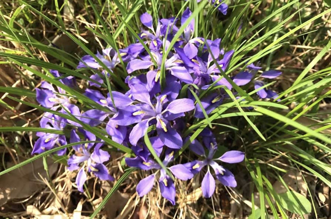エヒメアヤメは4月から5月にかけて直径4㎝ 前後の可憐な藍紫色の花をつけ、茎の長さは10㎝前後、開花時の葉の長さは15㎝から20㎝のアヤメ科の多年草です。