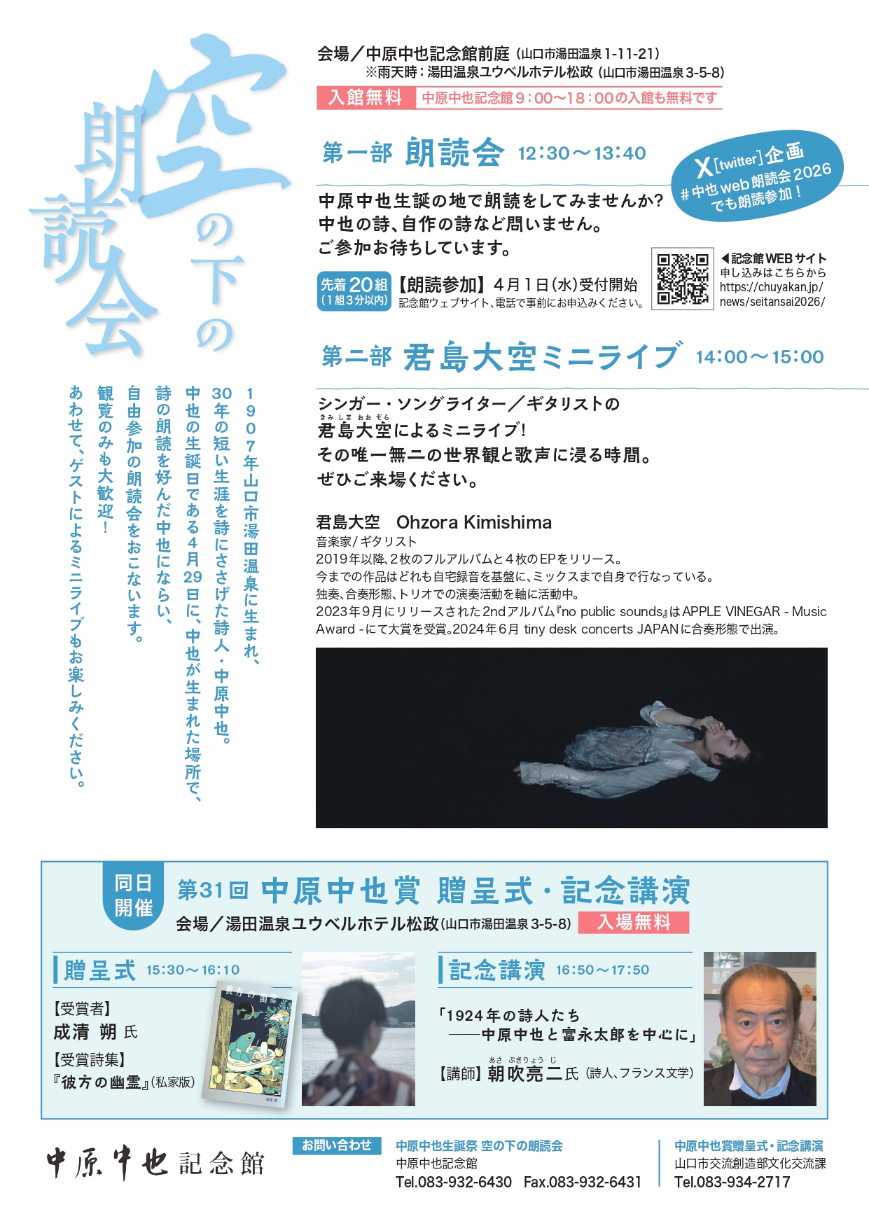 2026年4月29日(水・祝)中原中也生誕祭「空の下の朗読会」を開催します。
