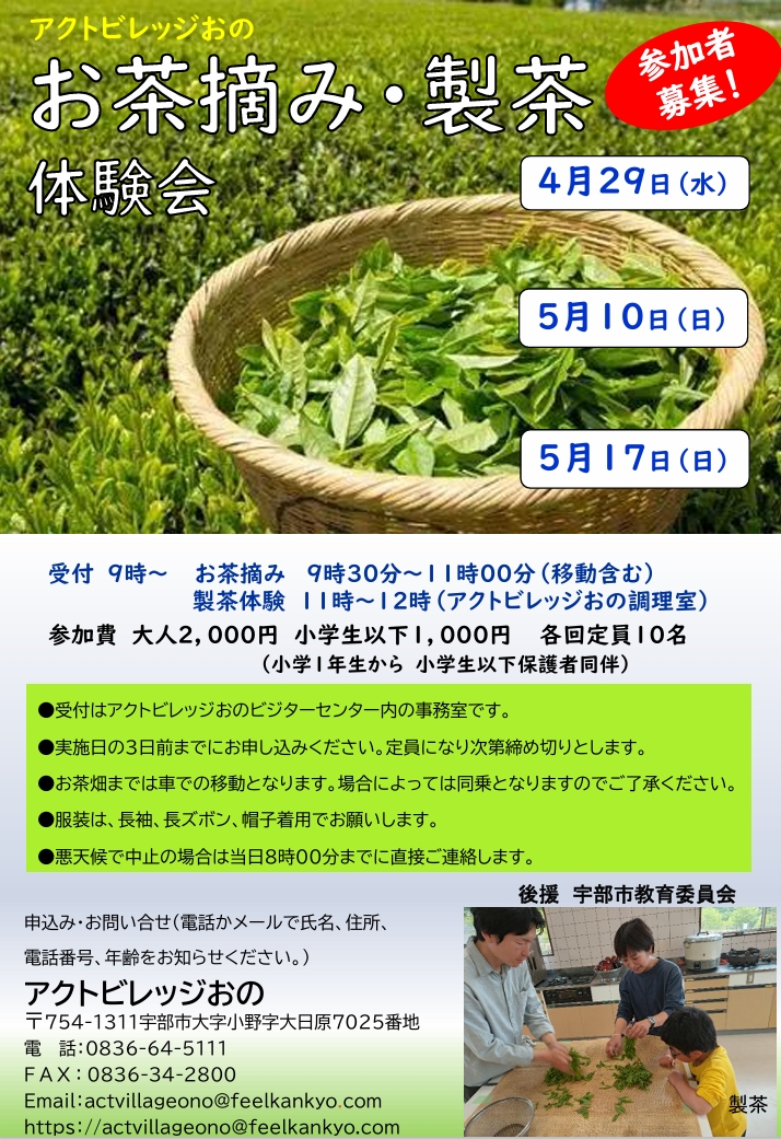 藤河内茶園でお茶の新芽を摘み、アクトビレッジおのの調理室で製茶作業をしましょう。