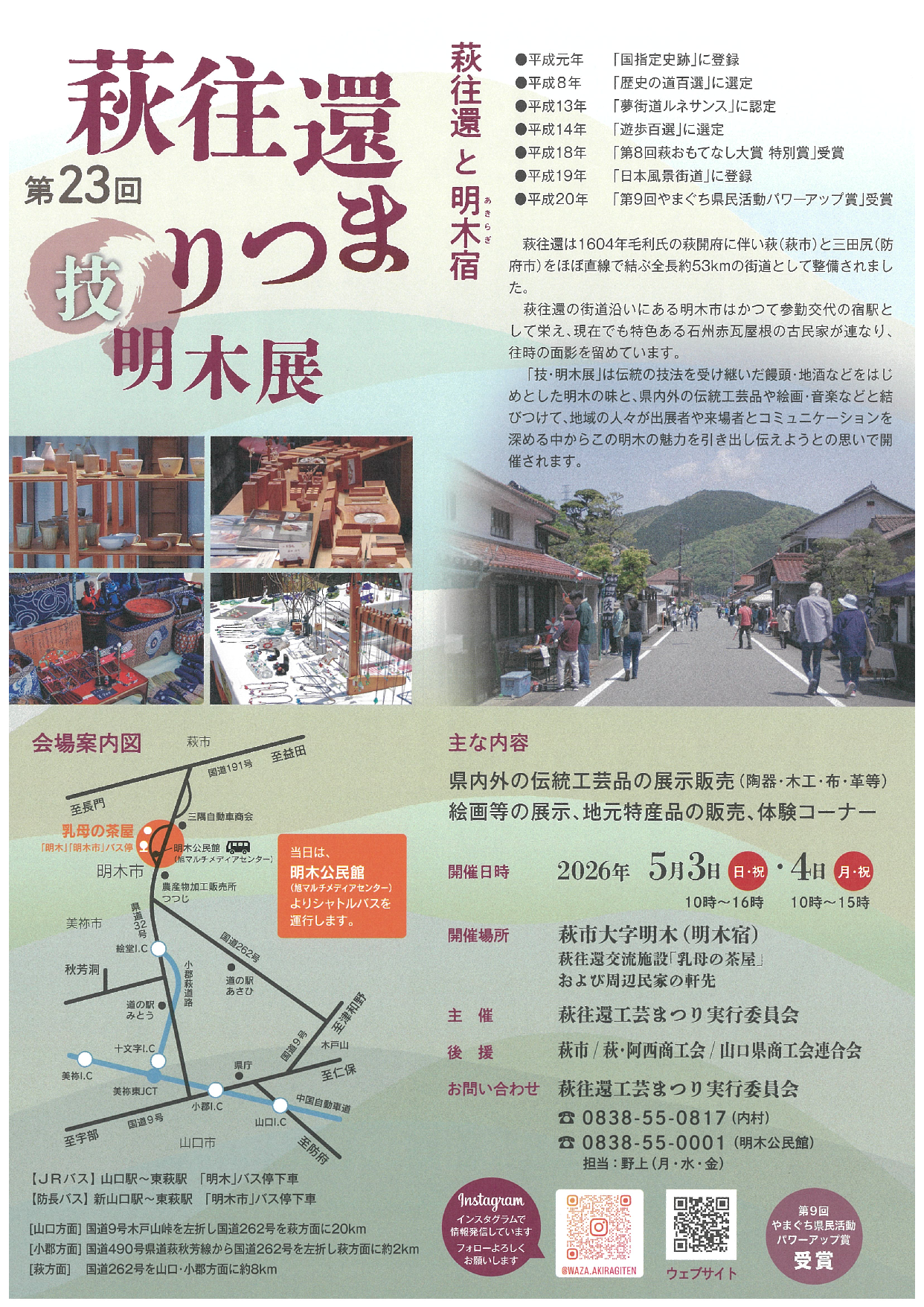 「技・明木展」は伝統の技法を受け継いだ饅頭・地酒などをはじめとした明木の味と、県内外の伝統工芸品や絵画・音楽などと結びつけて、地域の人々が出展者や来場者とコミュニケーションを深める中からこの明木の魅力を引き出し伝えようとの思いで開催されます。