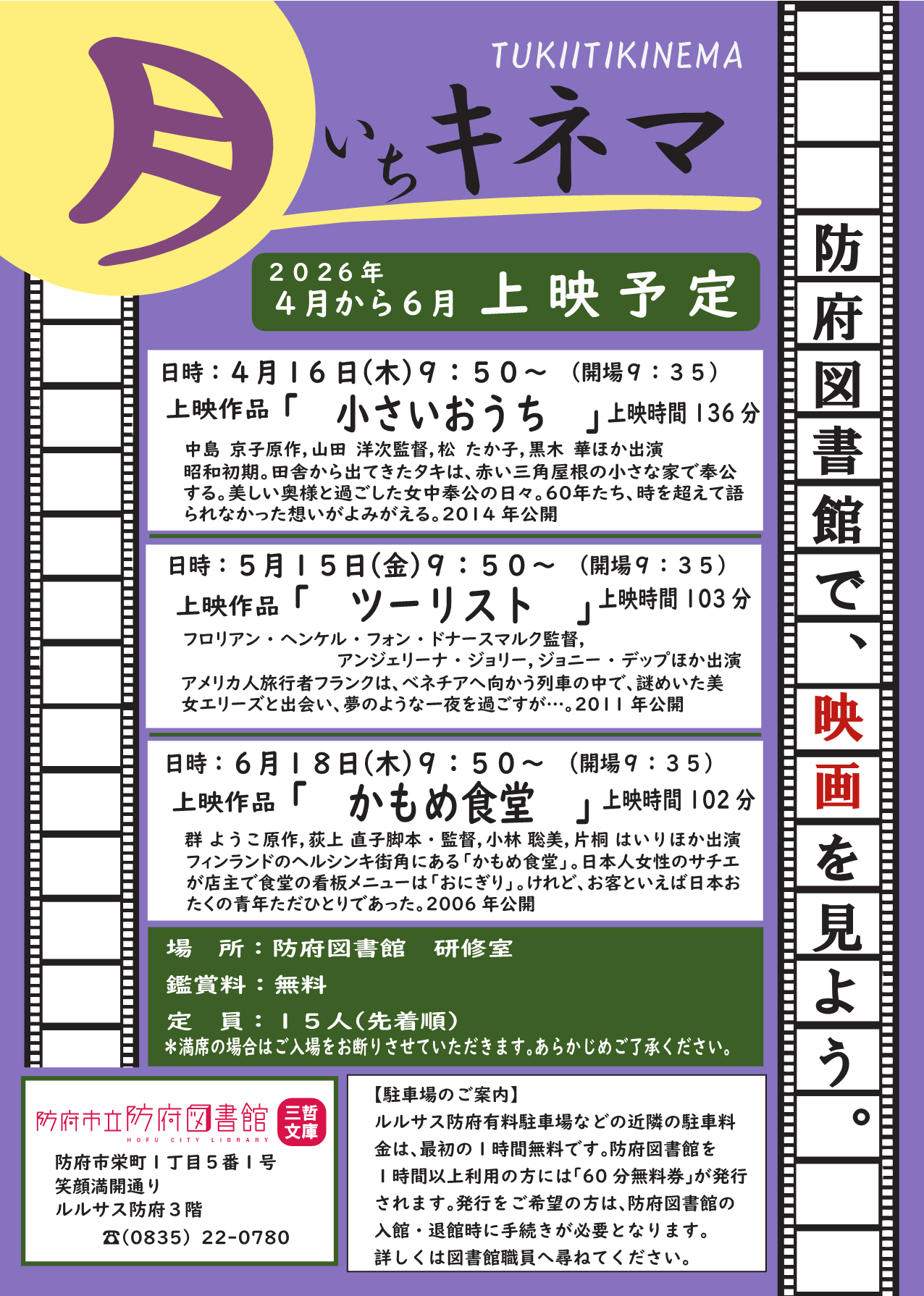 防府市立防府図書館では、毎月1回懐かしい映画や話題の映画を上映しています。