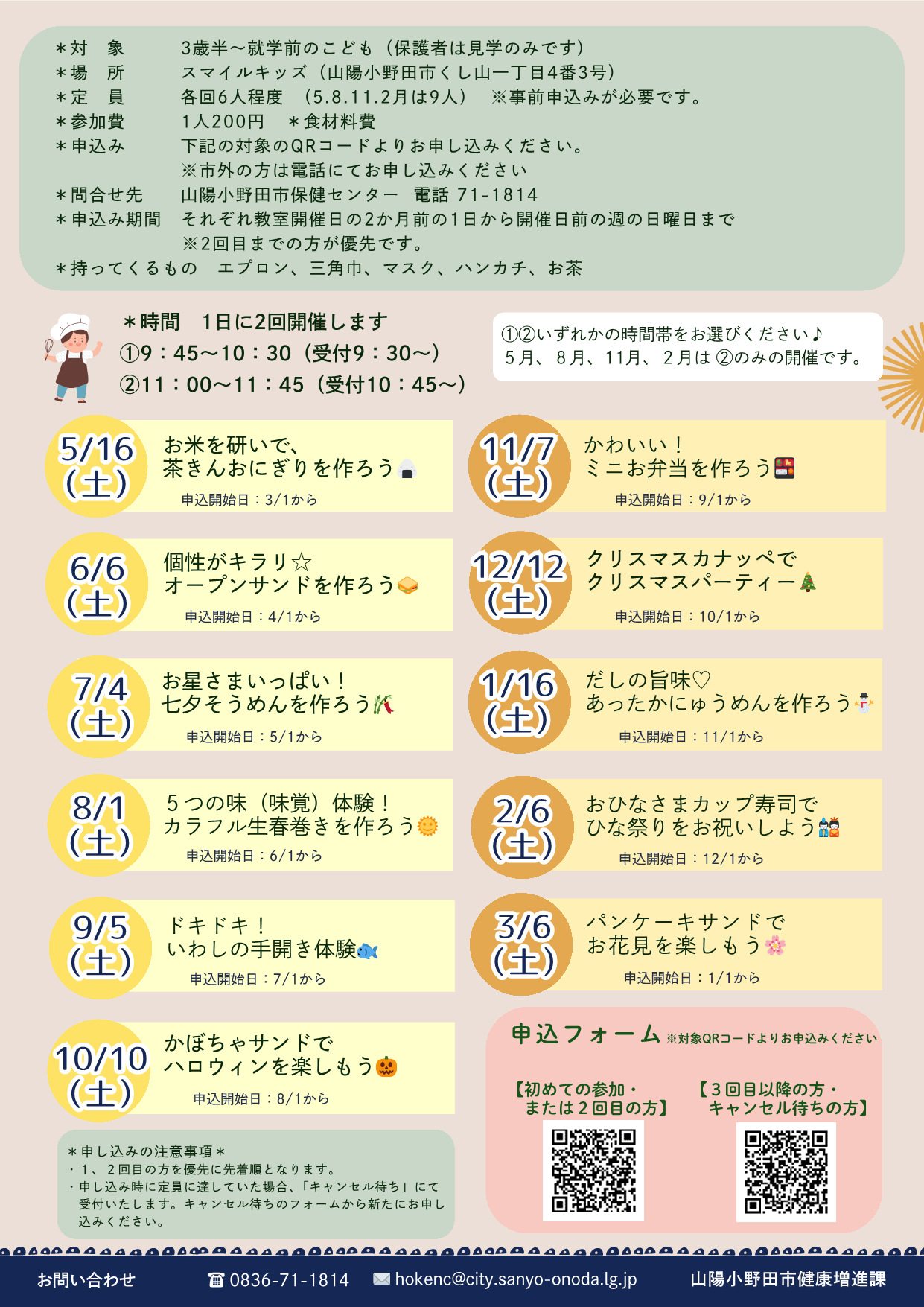 それぞれ教室開催日の2か月前の1日から開催日前の週の日曜日まで ※2回目までの方が優先です。
