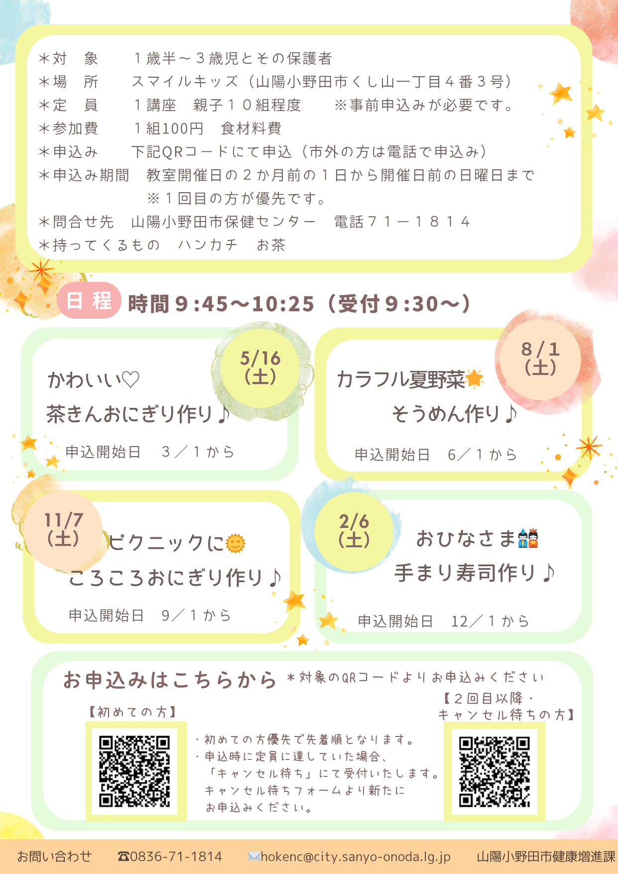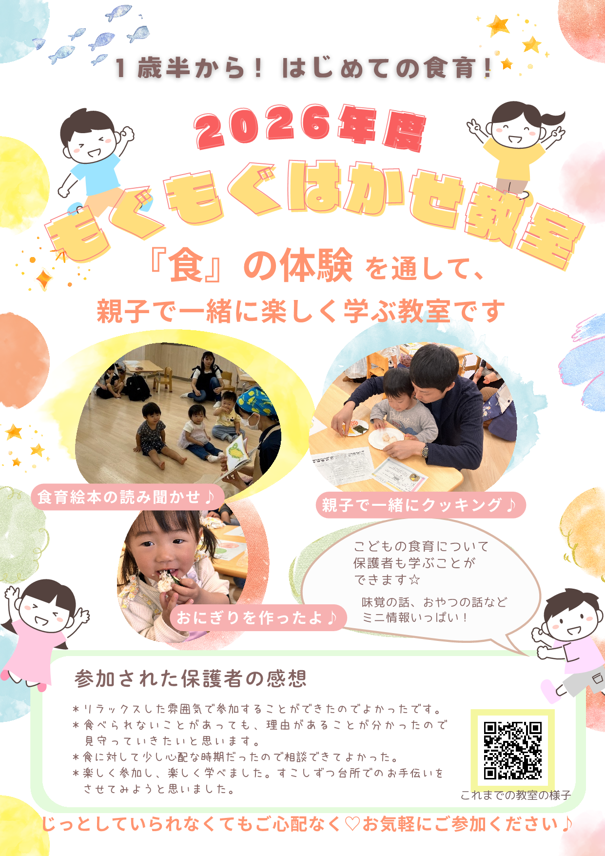 親子で簡単な調理体験や試食をしながら、楽しく食について学びます♪お子さんが、じっとしていられなくてもご心配なく♪お子さんと一緒にお気軽にご参加下さい。