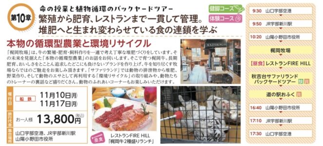 シーパーツでは「新しいかたちで挑む自動車リサイクル」を紹介、使用済自動車からどのようにして価値を生みだすのか?IT化により徹底管理された工場と作業の様子、そして自社開発の世界初タイヤ、ホイール脱着産業用ロボットを見学できます。秋吉台サファリランドでは園内の動物の排泄物から堆肥、野菜作り、そして動物のエサとして再利用する「環境リサイクル」の取り組みや「なぜ!調教が必要なの?」など、動物たちのトレーナーについての裏話など本ツアーでしかできない体験が可能です。※動物の体調などにより急遽内容を変更する場合があります