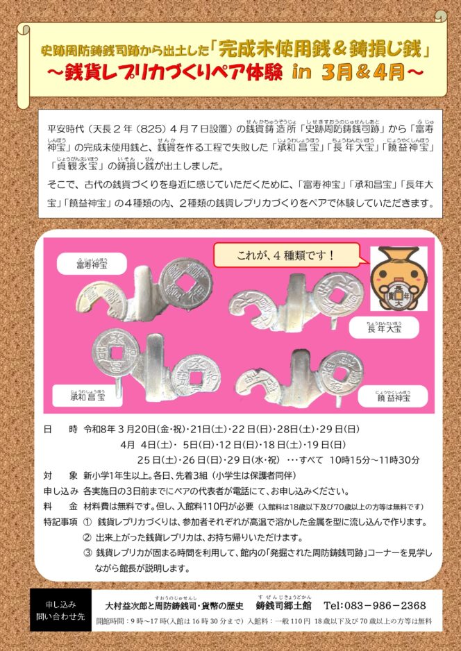 【要申込】史跡周防鋳銭司跡から出土した「完成未使用銭&鋳損じ銭」4人でワンセットレプリカづくり体験in新春