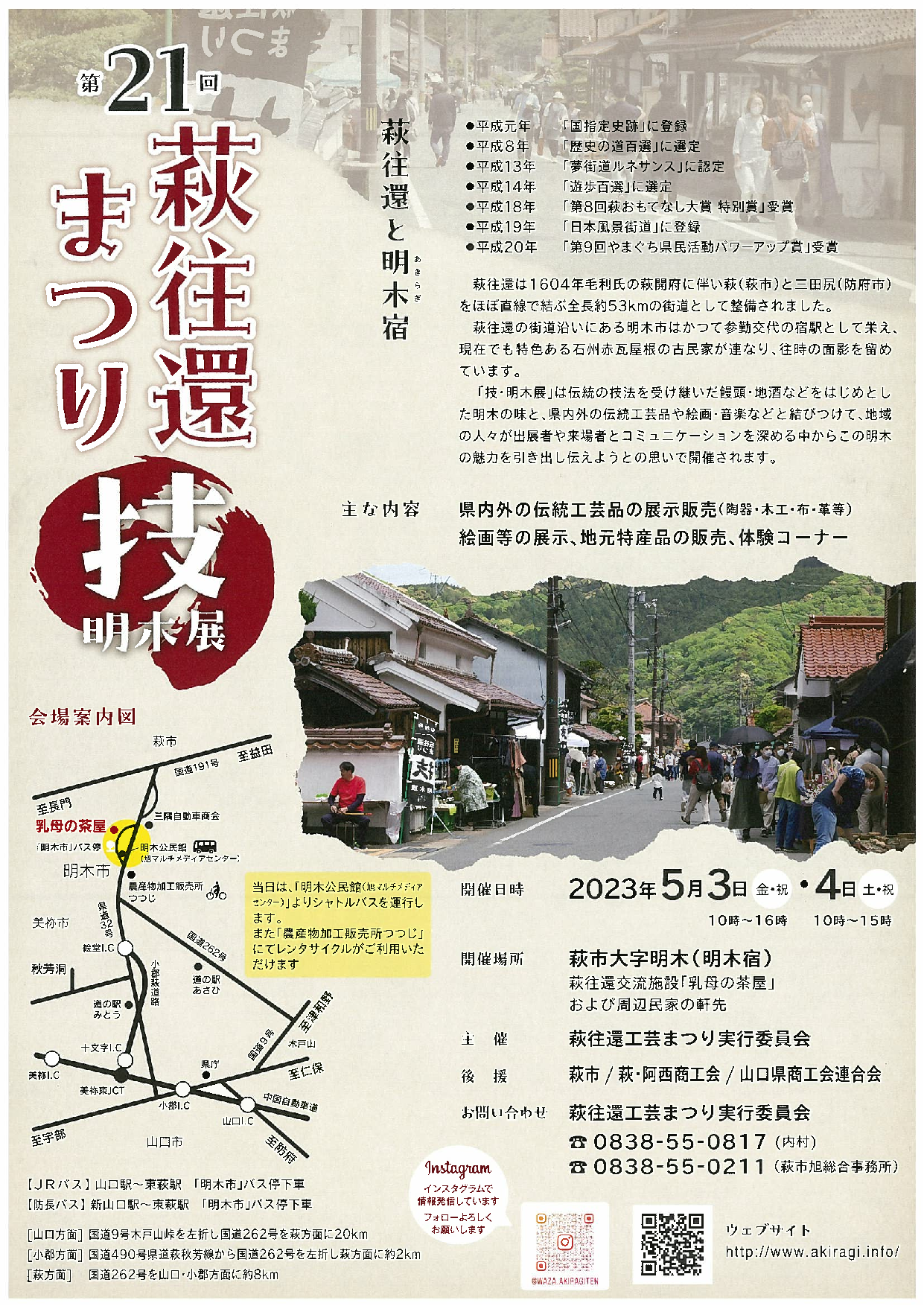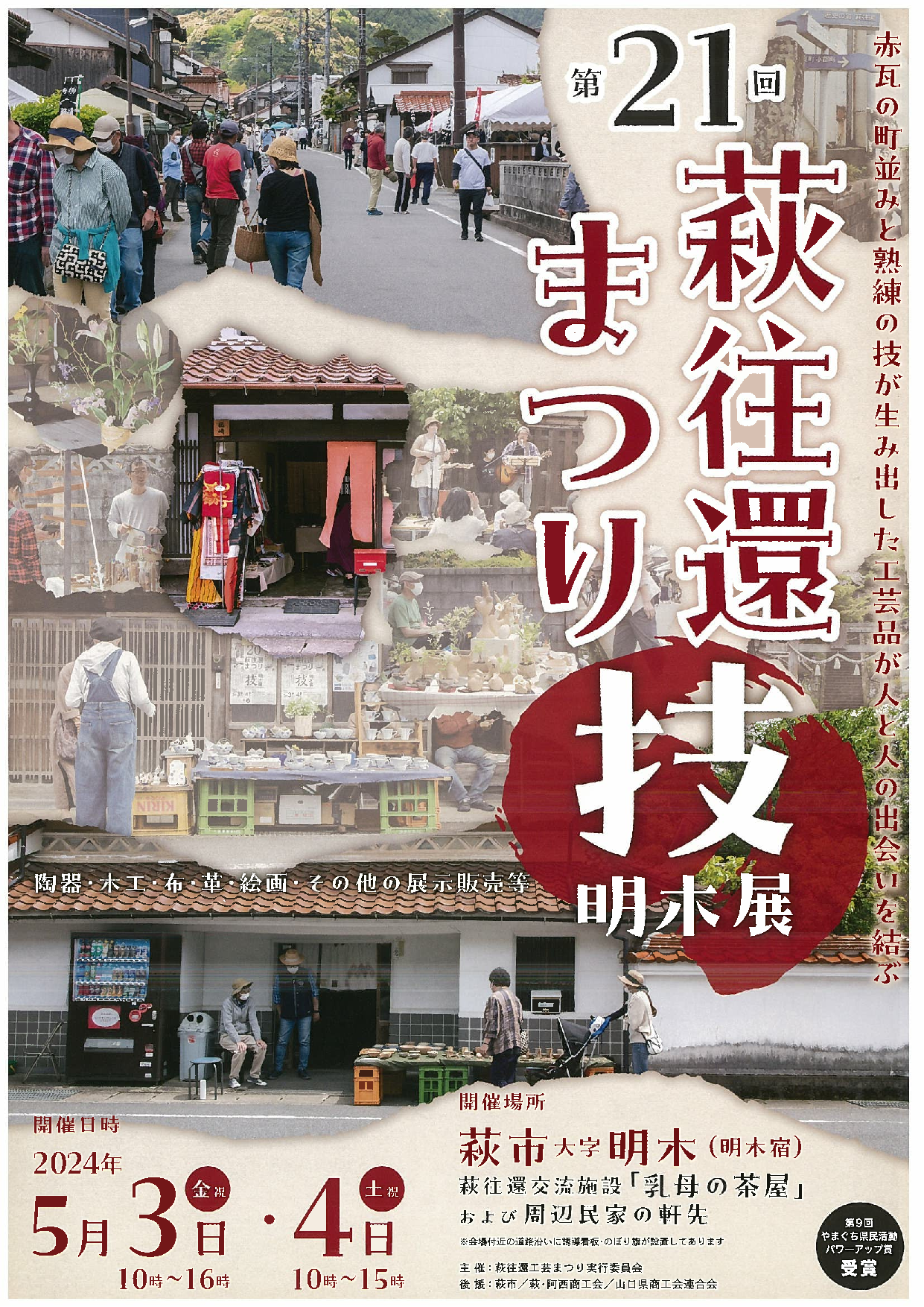萩往還交流施設「乳母の茶屋」や周辺民家の軒先を舞台に、県内外の伝統工芸品の展示販売(陶器・木工・布・革等)、絵画等の展示、地元特産品の販売、体験コーナーなどが開催されます。