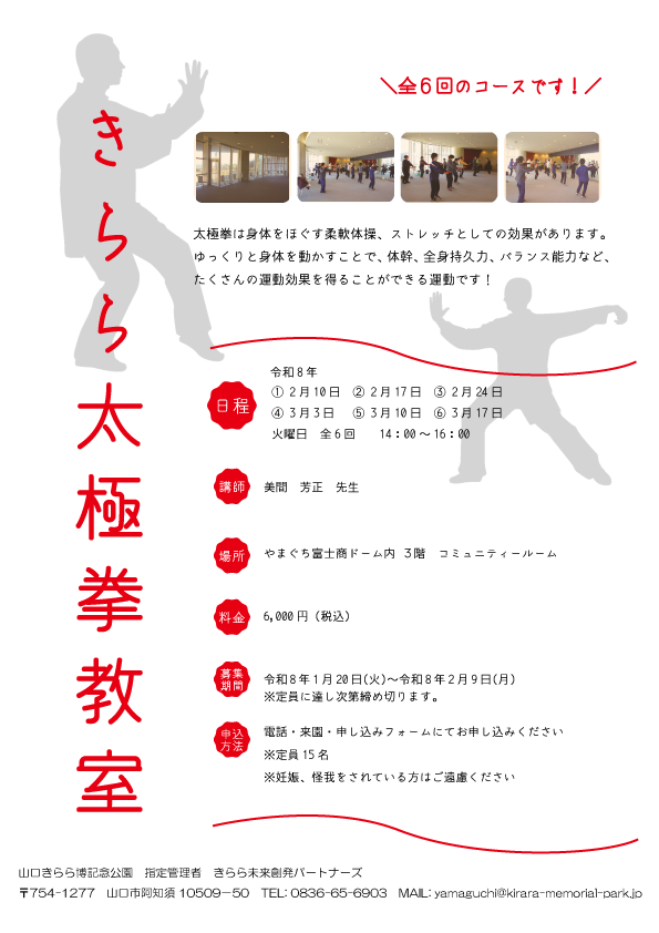 山口市 山口市 南エリア 阿知須 【要申込】きらら太極拳教室(2月~3月) 2026年2月10日、17日、24日、3月3日、10日、17日(前日火曜日) スポーツ・レジャー 体験 教室・研修 健康・美容・温泉