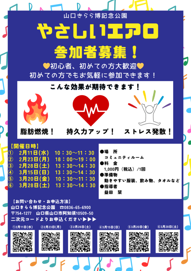 山口市 山口市 南エリア 阿知須 【要申込】やさしいエアロ教室 (2月~3月) 2026年2月11日(水)、23日(月)、28日(土)、3月15日(日)、20日(金)、28日(土) スポーツ・レジャー 体験 健康・美容・温泉 教室・研修