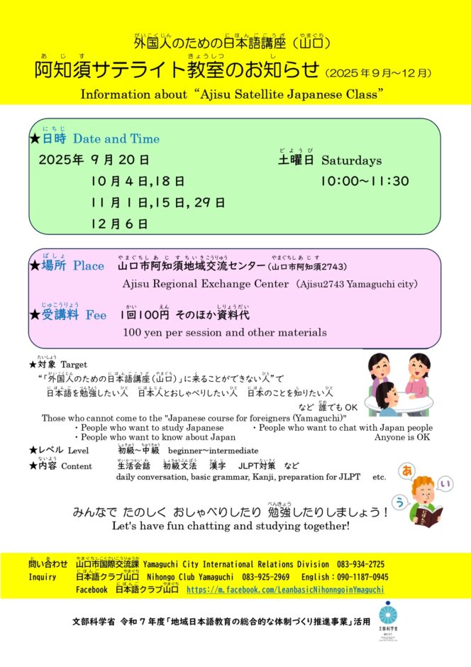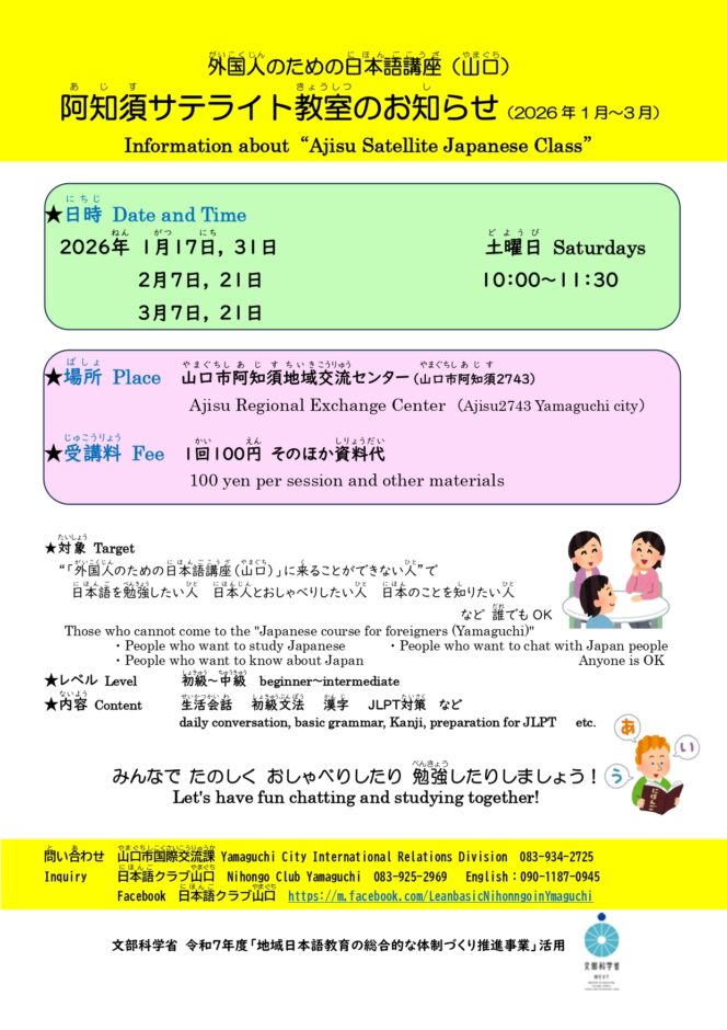 山口市 山口市 南エリア 阿知須 【冬期募集】外国人(がいこくじん)のための日本語講座(にほんごこうざ)/Japanese language class for foreigners 2026年(ねん)1月(がつ)17日(にち)から2026年(ねん)3月(がつ)21日(にち)までの毎月第1・3・5土曜日 その他 体験 教室・研修