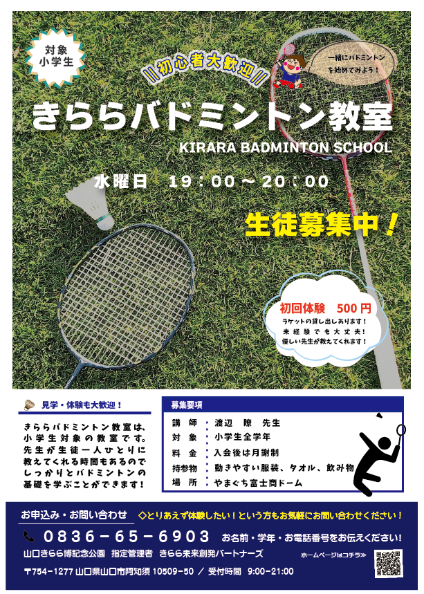 山口市 山口市 南エリア 阿知須 【要申込】きららバドミントン教室(10月~12月) 10月1日(水)、10月22日(水)、11月5日(水)、11月12日(水)、11月19日(水)、12月3日(水)、12月10日(水)、12月17日(水) キッズ スポーツ・レジャー 体験 教室・研修