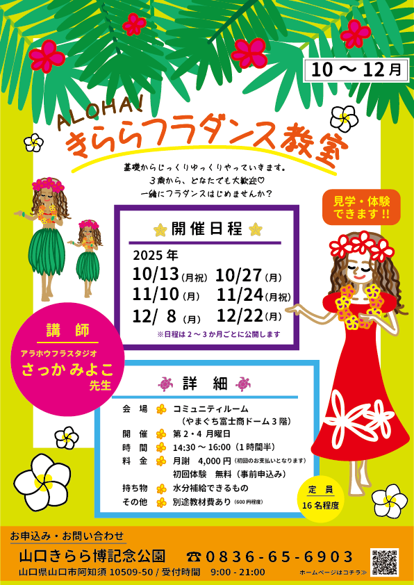 山口市 山口市 南エリア 阿知須 【要申込】きららフラダンス教室(10月~12月) 2025年10月13日(月祝)、27日(月)、11月10日(月)、24日(月祝)、12月8日(月)、22日(月) 体験 教室・研修 健康・美容・温泉 フィットネス・ヨガ