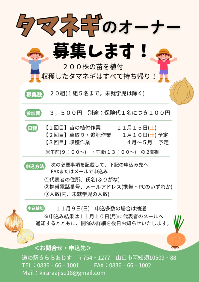 山口市 山口市 南エリア 阿知須 【要申込】タマネギのオーナー 募集 【1回目】苗の植付作業 2025年11月15日(土) 【2回目】草取り・追肥作業 2026年1月10日(土)予定 【3回目】収穫作業 2026年 4月〜5月予定 自然・生き物 体験 旬・味覚狩り 道の駅・マルシェ