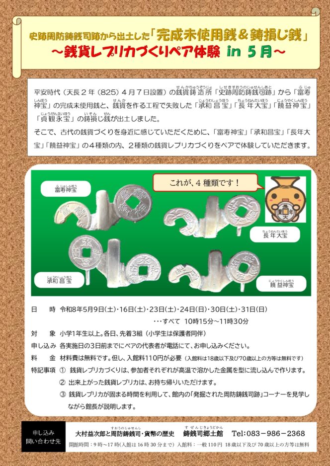 山口市 山口市 南エリア 鋳銭司 【要申込】史跡周防鋳銭司跡から出土した「完成未使用銭&鋳損じ銭」銭貨レプリカづくりペア体験in 3月&4月 2026年3月20日(金祝)・21日(土)・22日(日)・28日(土)・29日(日) 4月4日(土)・5日(日)・12日(日)・18日(土)・19日(日)・25日(土)・26日(日)・29日(水祝) アート・歴史・文化 体験 教室・研修