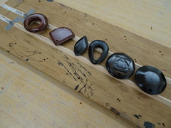 布で拭いて艶を出す「拭き漆」の技法でアクセサリーやオブジェを製作します